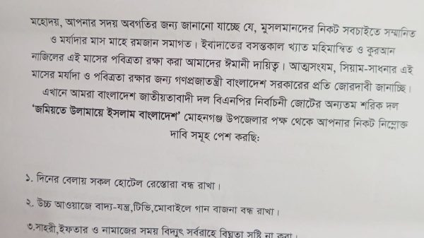 চয়ন চৌধুরী, (ভ্রাম্যমাণ প্রতিবেদক)নেত্রকোনার মোহনগঞ্জে রমজানের পবিত্রতা রক্ষায় উপজেলা প্রশাসনের নিকট জমিয়তে উলামায়ে ইসলামের পক্ষ থেকে স্মারক লিপি প্রদান করা হয়েছে।বুধবার দুপুরে জমিয়তে উলামায়ে ইসলাম বাংলাদেশের মোহনগঞ্জ উপজেলা শাখার সভাপতি মাওলানা মাহমুদুল হাসান ও সংগঠনটির নেত্রকোনা জেলা শাখার সাংগঠনিক সম্পাদক
