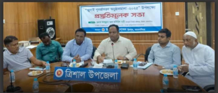 মোঃ আসাদুল ইসলাম মিন্টু/ময়মনসিংহের ত্রিশালে আগামী জুলাই পুনর্জাগরণ অনুষ্ঠানমালা সফলভাবে উদযাপনের লক্ষ্যে প্রস্তুতিমূলক সভা অনুষ্ঠিত হয়েছে।রবিবার (১৩ জুলাই) ত্রিশাল উপজেলা পরিষদের সম্মেলন কক্ষে এ সভার আয়োজন করে উপজেলা প্রশাসন।সভায় সভাপতিত্ব করেন উপজেলা নির্বাহী অফিসার আব্দুল্লাহ আল বাকিউল বারী।এ সময় আরও উপস্থিত ছিলেন, সহকারী কমিশনার (ভূমি) মাহবুবুর রহমান, উপজেলা প্রকল্প বাস্তবায়ন কর্মকর্তা মোহাম্মদ শহীদ উল্লাহ, ওসি তদন্ত মোবারক হোসেন, উপজেলা সমাজসেবা কর্মকর্তা মাহমুদুল হাসান, উপজেলা পরিসংখ্যান কর্মকর্তা মুশফিকুর রহমান, উপজেলা বিএনপির যুগ্ম আহ্বায়ক আনিসুজ্জামান মৃধা, শহীদ ইনতিশারের পিতা আ হ ম এনামুল হক লিটনসহ স্থানীয় গণমাধ্যমকর্মী ও বিভিন্ন পেশার প্রতিনিধিগণ।