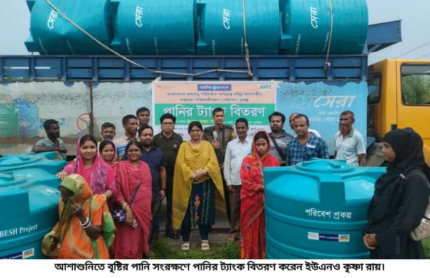 আব্দুর রশিদ /আশাশুনিতে বৃষ্টির পানি (সুপয়ে পানি) সংরক্ষণের লক্ষ্যে পানির ট্যাংক বিতরণ করা হয়েছে। বুধবার (১৬ জুলাই) বেলা সাড়ে ১১টায় উপজেলার বুধহাটা ইউনিয়নের চাপড়া মরিচ্চাপ রিভার ভিউ কেওড়া পার্ক চত্বরে এ পানির ট্যাংক বিতরণ করা হয়।নেটজ্ বাংলাদেশ এর সহায়তায় গবেষণা প্রতিষ্ঠান বারসিক বাংলাদেশের জলবায়ু পরিবর্তনে ক্ষতিগ্রস্ত দরিদ্র জনগোষ্ঠীর সক্ষমতা শক্তিশালীকরণ (পরিবেশ) প্রকল্পের আওতায় অনুষ্ঠানে প্রধান অতিথি হিসাবে উপস্থিত থেকে পানির ট্যাংক হস্তান্তর করেন, উপজেলা নির্বাহী কর্মকর্তা কৃষ্ণা রায়। বারসিকের উপজেলা সমন্বয়কারী আসাদুল ইসলামের সঞ্চালনায় অনুষ্ঠানে পরিবেশ প্রকল্পের জেলা সমন্বয়কারী মো. মাসুম বিল্লাহ, উপজেলা নির্বাহী কর্মকর্তার সহকারী প্রশাসনিক কর্মকর্তা একেএম মাহবুবুুল হক, আশাশুনি সদর ইউনিয়নের প্যানেল চেয়ারম্যান মোঃ শরিতুল্যাহ, ইউপি সদস্য মোঃ শাহিনুর আলম শাহিন, ইউপি সদস্য তারক চন্দ্র মন্ডল, ইউপি সদস্য তপন সরকার, ইউপি সদস্য (সংরক্ষিত) মোছাঃ ময়না খাতুন, আশাশুনি প্রেস ক্লাবে সাবেক সভাপতি জিএম মুজিবর রহমান, সাংবাদিক বিএম আলাউদ্দীন, আইডিয়াল কর্মকর্তা সুব্রত বাছাড়সহ সুশীল সমাজের প্রতিনিধি ও প্রকল্পের অংশগ্রহনকারীবৃন্দ উপস্থিত ছিলেন। অনুষ্ঠানে জানানো হয়, পরিবেশ প্রকল্পের শ্যামনগর ও আশাশুনি উপজেলার ৮টি ইউনিয়নের সিএসও সদস্যদের মাঝে এক হাজার লিটারের ৫৯৭টি এবং ৩ হাজার লিটারের ২টি পানির ট্যাংক পর্যায়ক্রমে বিতরণ করা হবে। এর মধ্যে আজকে ৩০টা ট্যাংকি বিতরণ করা হচ্ছে।