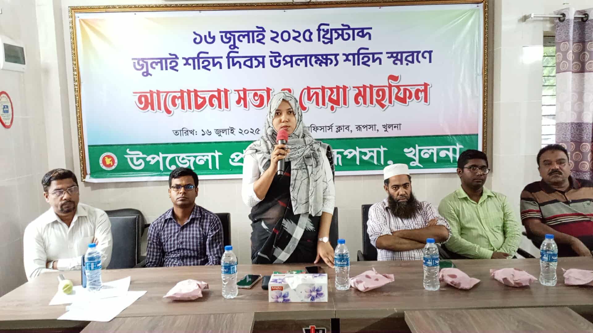 আজিজুল ইসলাম/রূপসায় জুলাই শহিদ দিবস উপলক্ষে উপজেলা প্রশাসন আয়োজিত আলোচনা সভা ও দোয়া মাহফিল ১৬ জুলাই সকাল ১১ টায় উপজেলা অফিসার্স ক্লাব মিলনায়তনে অনুষ্ঠিত হয় । আলোচনা সভায় সভাপতিত্ব করেন নির্বাহী অফিসার সানজিদা রিকতা। বক্তৃতা করেন কৃষি কর্মকর্তা তরুণ কুমার বালা, প্রাণিসম্পদ কর্মকর্তা ডাঃ আহসান হাবিব প্রামানিক , পরিবার পরিকল্পনা কর্মকর্তা সাইদুর রহমান , পল্লী উন্নয়ন কর্মকর্তা তারেক ইকবাল আজিজ ,আইসিটি কর্মকর্তা ইমরান হোসেন , মহিলা বিষয়ক কর্মকর্তা ফারহানা ইয়াসমিন , প্রকল্প বাস্তবায়ন কর্মকর্তা মোঃ বোরহান উদ্দিন , সমাজ সেবা কর্মকর্তা রাকিবুল ইসলাম তরফদার, নির্বাচন অফিসার মুরাদ হোসেন, সমবায় কর্মকর্তা ফরিদ আহমেদ , উপজেলা বিএনপির আহবায়ক মোল্লা সাইফুর রহমান, আইচগাতি ইউপি চেয়ারম্যান (ভারপ্রাপ্ত) মাসুম বিল্লাহ , শ্রীফলতলা ইউপি চেয়ারম্যান (ভারপ্রাপ্ত) জিয়াউল ইসলাম বিশ্বাস , টি,এস,বি,ইউপি চেয়ারম্যান (ভারপ্রাপ্ত) আসাবুর রহমান , কাজদিয়া সরকারি উচ্চ মাধ্যমিক বিদ্যালয়ের অধ্যক্ষ অজিত কুমার সরকার, মুক্তিযোদ্ধা আব্দুল মালেক , রূপসা প্রেসক্লাবের সভাপতি তরিকুল ইসলাম ডালিম ,ইসলামী আন্দোলন নেতা মাওঃ হেলাল উদ্দিন, জামায়াতে ইসলামী শুরা সদস্য জাহাঙ্গীর ফকির, ছাত্র প্রতিনিধি তামিম হাসান লিওন, তরিকুল ইসলাম , শামীম হাওলাদার , মোঃ ইউনুছ, মোঃ শাহ জাহান প্রমূখ । অনুষ্ঠান সার্বিক পরিচালনা করেন শিক্ষা কর্মকর্তা আমিনুল ইসলাম।
