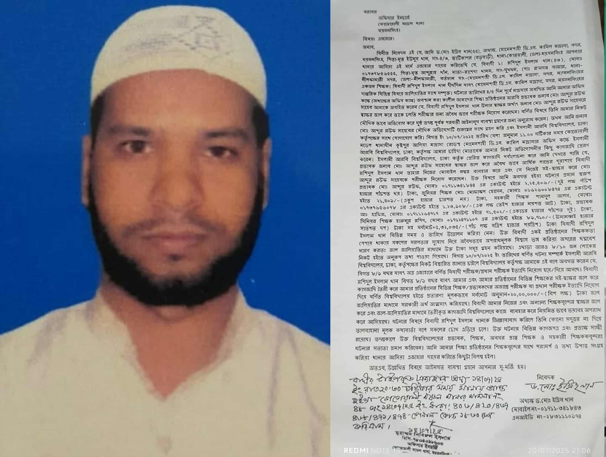 গোলাম কিবরিয়া পলাশ/ময়মনসিংহ সদর উপজেলার ঐতিহ্যবাহী মোমেনশাহী ডিএস কামিল মাদ্রাসার এক শিক্ষকের বিরুদ্ধে দীর্ঘদিন ধরে শিক্ষক ও প্রতিষ্ঠানের স্বাক্ষর জাল করে পরীক্ষক নিয়োগ এবং আর্থিক লেনদেন দেখিয়ে প্রায় ২০ লাখ টাকা আত্মসাতের অভিযোগ উঠেছে। এ ঘটনায় অভিযুক্ত শিক্ষক রশিদুল ইসলাম খানের বিরুদ্ধে থানায় এজাহার দায়ের করেছেন প্রতিষ্ঠানটির অধ্যক্ষ ড. মো. ইদ্রিস খান। এ ঘটনায় জড়িত শিক্ষক রসিদুল ইসলম খানকে গ্রেপ্তার করা হয়েছে।অভিযোগ সূত্রে জানা গেছে, অভিযুক্ত রশিদুল ইসলাম খান (৪৩) নীলফামারী জেলার রামগঞ্জ বাজার এলাকার বাসিন্দা। তিনি মোমেনশাহী ডিএস কামিল মাদ্রাসায় দীর্ঘদিন ধরে শিক্ষকতা করছেন। এ সুযোগে তিনি প্রতিষ্ঠানের বিভিন্ন দাপ্তরিক কার্যক্রমে জালিয়াতির মাধ্যমে নিজের নামে আর্থিক সুবিধা আদায়ের নেপথ্যে জড়িয়ে পড়েন।অধ্যক্ষ জানান, কিছুদিন আগে আরবি প্রভাষক মো. আব্দুর রউফ মৌখিক অভিযোগ করেন যে, তার স্বাক্ষর জাল করে রশিদুল ইসলাম নিজেই তাকে চলতি পরীক্ষার জন্য অবৈধভাবে পরীক্ষক নিয়োগ দেখান। বিষয়টি গুরুত্ব দিয়ে অধ্যক্ষ ইসলামী আরবি বিশ্ববিদ্যালয়ের সঙ্গে যোগাযোগ করলে বিশ্ববিদ্যালয় কর্তৃপক্ষ থেকে প্রেরিত গোপন নথিপত্র যাচাই করে অভিযোগের সত্যতা মেলে।নথিপত্র ঘেঁটে দেখা যায়, মো. আব্দুর রউফ, মো. মোফাজ্জল হোসেন, শামসুল আলম, আব্দুল হাফিজ ও হারুনুর রশিদের নামসহ ১০/১২জনের নাম ব্যবহার করে, তাদের অজান্তে স্বাক্ষর জাল করে রশিদুল ইসলাম বিভিন্ন সময় অনৈতিক আর্থিক লেনদেন সম্পন্ন করেন। এসব লেনদেনের মাধ্যমে প্রায় ৫ লাখ ৩২ হাজার টাকার বেশি উত্তোলন করা হয়েছে বলে অভিযোগে উল্লেখ রয়েছে।অধ্যক্ষের দাবি, দীর্ঘ ৮-৯ বছর ধরে রশিদুল ইসলাম এমন প্রতারণামূলক কার্যক্রম চালিয়ে আসছেন। এ সময়ের মধ্যে প্রায় ২০ লাখ টাকারও বেশি সরকারি অর্থ আত্মসাৎ করেছেন তিনি।ঘটনার বিষয়ে অভিযুক্ত শিক্ষককে জিজ্ঞাসাবাদ করা হলে তিনি সন্তোষজনক কোনো ব্যাখ্যা না দিয়ে কৌশলে বিষয়টি এড়িয়ে যান। অধ্যক্ষের ভাষ্যমতে, ঘটনায় জড়িত থাকার বিষয়ে লিখিত প্রমাণ, প্রত্যক্ষদর্শী ও ভুক্তভোগী শিক্ষকরা সাক্ষ্য দিতে প্রস্তুত রয়েছেন।এ বিষয়ে কোতোয়ালী মডেল থানার অফিসার ইনচার্জ (ওসি) বলেন, কোতোয়ালী মডেল থানার মামলা নং ৪৮(৭)২০২৫ ধারা -৪০৬/৪২০/৪৬৭/৪৬৮/৪৭১/৪৭৪ পেনাল কোড ১৮৬০ রুজু করা হয়। মামলাটি এস আই মাসুদ জামালী তদন্ত করছেন। ঘটনায় জড়িত রসিদুল ইসলম খানকে গ্রেপ্তার করা হয়েছে। যথাসময়ে আদালতে সোপর্দ করা হবে।