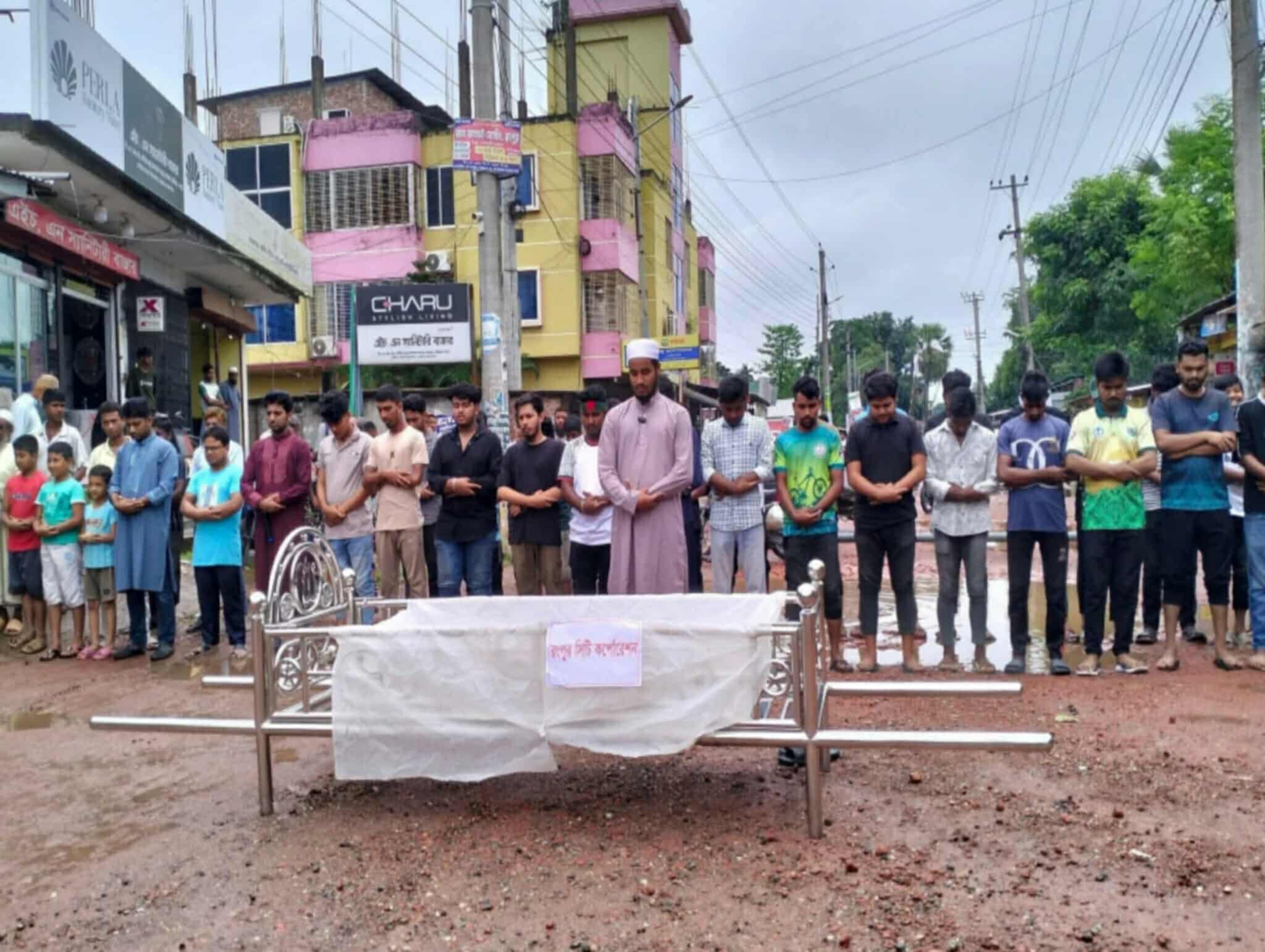 শরিফা বেগম শিউলী/রংপুর নগরীর অন্যতম ব্যস্ত সড়ক জাহাজ কোম্পানি মোড় থেকে সাতমাথা পর্যন্ত প্রায় ৫ কিলোমিটার রাস্তা দীর্ঘদিন ধরে চরম বেহাল অবস্থায় রয়েছে। গর্ত, ভাঙাচোরা আর পানি জমে এই সড়কে চলাচল হয়ে পড়েছে ঝুঁকিপূর্ণ। স্থানীয়রা অভিযোগ করেছেন, বারবার গণমাধ্যমে প্রতিবেদন প্রকাশিত হলেও রংপুর সিটি কর্পোরেশন কোনো উদ্যোগ নেয়নি।সড়কের এমন অবস্থা আর সিটি কর্পোরেশনের নিস্ক্রিয়তার প্রতিবাদে ভিন্নধর্মী কর্মসূচি পালন করেছে এলাকাবাসী। রোববার (২০ জুলাই) বেলা সাড়ে ১১টার দিকে সাতমাথা রেলগেট সংলগ্ন মরিয়ম চক্ষু হাসপাতালের পাশে আয়োজন করা হয় রংপুর সিটি কর্পোরেশন কর্তৃপক্ষের প্রতীকী গায়েবানা জানাযা।এই অভিনব কর্মসূচিতে অংশ নেন সাতমাথার বাসিন্দা রাজিমুজ্জামান হৃদয়, প্রান্ত হোসেন, মো. নাঈম, সাকিব হোসেন, মোহাম্মদ হাসান, হোসাইন, সৈকত ইসলাম, তানভীর ইসলাম, নাঈম হক, মাহিমসহ আরও অনেকে। গায়েবানা জানাজা পরিচালনা করেন মাদ্রাসাছাত্র রাহুল ইসলাম। কর্মসূচিতে তরুণদের অংশগ্রহণই ছিল বেশি।