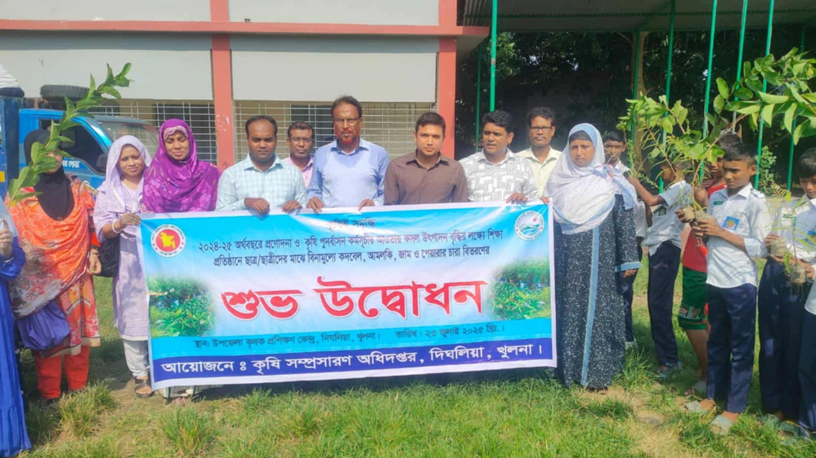 মোঃরানা মোল্লা /কৃষি মন্ত্রণালয়ের আওতায় কৃষি পুনর্বাসন কার্যক্রমের অংশ হিসেবে ২০২৪-২৫ অর্থবছরে দিঘলিয়ায় শিক্ষাপ্রতিষ্ঠানে ফল উৎপাদন বৃদ্ধির লক্ষ্যে ছাত্রছাত্রীদের মাঝে গাছের চারা বিতরণ কর্মসূচির শুভ উদ্বোধন অনুষ্ঠিত হয়েছে।বুধবার (২৩ জুলাই) বেলা ১২ টায় দিঘলিয়া উপজেলার কৃষি অফিস আয়োজিত এই কর্মসূচিতে প্রধান অতিথি হিসেবে উপস্থিত ছিলেন ও উদ্বোধন করেন উপজেলা নির্বাহী অফিসার মো: আরিফুল ইসলাম। উদ্বোধনী অনুষ্ঠানে সভাপতিত্ব করেন উপজেলা কৃষি অফিসার মো: কিশোর আহমেদ। বিশেষ অতিথি হিসেবে উপস্থিত ছিলেন উপজেলা সহকারী কমিশনার (ভূমি) দেবাংশু বিশ্বাস, কৃষি সম্প্রসারণ অফিসার কপিল দেব বসাক। উক্ত উদ্বোধনী অনুষ্ঠানে সার্বিক সঞ্চালনায় ছিলেন উপজেলা কৃষি সম্প্রসারণ অধিদপ্তরের উপ-সহকারী কৃষি অফিসার মোঃ মনিরুল ইসলাম। এসময় আরো উপস্থিত ছিলেন দিঘলিয়া উপজেলা কৃষি অফিসের সকল পর্যায়ের কর্মকর্তা কর্মচারী গন।কর্মসূচির আওতায় শিক্ষার্থীদের মাঝে বিভিন্ন প্রজাতির ফলদ, ভেষজ ও ঔষধি গাছের চারা বিনামূল্যে বিতরণ করা হয়। এতে উপস্থিত বক্তারা বলেন, "গাছ আমাদের জীবনের গুরুত্বপূর্ণ অংশ। পরিবেশ রক্ষা, খাদ্য নিরাপত্তা এবং অর্থনৈতিক উন্নয়নের জন্য গাছের ভূমিকা অনস্বীকার্য। তাই শিক্ষার্থীদের ছোটবেলা থেকেই গাছ লাগানো ও পরিচর্যার প্রতি আগ্রহী করে তুলতে হবে।অনুষ্ঠানে সেনহাটি মাধ্যমিক বিদ্যালয়ের শিক্ষার্থী ও বিভিন্ন প্রতিষ্ঠানের মাঝে কদবেল, আম, জাম, পেয়ারা, নিম সহ নানা ধরনের ৯৫০ টি গাছের চারা বিতরণ করা হয়। কৃষি সম্প্রসারণ অধিদপ্তর, দিঘলিয়া খুলনা কর্তৃক আয়োজিত এ কার্যক্রম স্থানীয়ভাবে ব্যাপক সাড়া ফেলেছে।