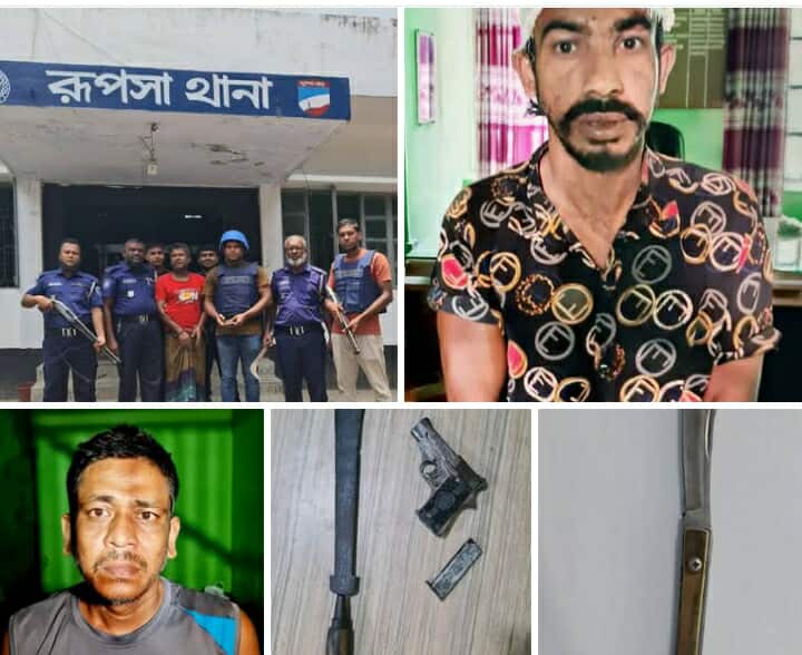 আজিজুল ইসলাম/রূপসা থানা পুলিশের অভিযানে পিস্তল এবং ধারালো অস্ত্রসহ তিনজনকে গ্রেফতার।গ্রেফতারকৃতদের নিকট থেকে ম্যাগজিনসহ ৭ ইঞ্চি লম্বা একটি পিস্তল , কাঠের বাটসহ লম্বা ২৪ ইঞ্চি একটি রামদা , একটি স্টিলের তৈরী চাকু উদ্ধার করা হয়গ্রেফতারকৃতরা হলেন ঘাটভোগ ইউনিয়নের নিখিল দাস এর ছেলে ও ইউনিয়ন আওয়ামী লীগের সাধারণ সম্পাদকনিপুন দাশ (৪১) ডোবা গ্রামের নিখিল মহলীর ছেলে ইউনিয়ন আওয়ামী লীগের সদস্যনিপেন মহলী (৪১) ও নতুন দিয়া গ্রামের মনোরঞ্জন মহান্তর ছেলে জয়বাংলা ব্রিগেড সৈনিক লীগের থানা সেক্রেটারি অভিজিত মহান্ত (৩০) ।এজাহার সূত্রে জানা যায়, সোমবার ২১ জুলাই সন্ধ্যা অনুমান ৭.৩০ টার সময় রূপসা থানা পুলিশ সংবাদ পাই কয়েক ব্যক্তি উপজেলার ঘাটভোগ ইউনিয়নের ডোবা গ্রামে পথচারীদের অস্ত্র দেখিয়ে মারধর করেছে। সংবাদ পেয়ে থানা অফিসার ইনচার্জ মোহাম্মদ মাহফুজুর রহমান সঙ্গীয় অফিসার ফোর্স সহ ঘটনাস্থলে পৌঁছে দুষ্কৃতিকারীদের গ্রেপ্তারের জন্য এলাকায় অভিযান চালায় ।রাত ব্যাপী অভিযান চালিয়ে ২২জুলাই সকাল অনুমান ০৭.৪০ টায় সময় খবর পাই দুষ্কৃতিকারীরা ডোবা গ্রাম থেকে প্রায় দুই কিলোমিটার ভিতরে বিলের মধ্যে ঘেরের বাসায় অবস্থান করছে। উক্ত সংবাদের ভিডিত্ততে অনুমান ০৮.৫০ টার সময় ডোবা সরকারী প্রাথমিক বিদ্যালয়ের সামনে রাস্তায় পৌঁছে ধৃত আসামীদেরকে দেশীয় অস্ত্র-সস্ত্র সহ পাই। তখন পুলিশ ও স্থানীয় জনতা দুষ্কৃতিকারীদের হাতে দেশীয় অস্ত্র সস্ত্রসহ তাদের ঘিরে ফেলে।এক পর্যায়ে অনুমান ১০:৪০টার সময় কৌশলে তাদের কাছে পৌঁছে গিয়ে পুলিশ ও জনতা সকলে একযোগে জাপটে ধরে ধস্তাধস্তি করে তাদেরকে নিরস্ত্র করি। এ সময় তাদের হাত থেকে রামদা, চাকু উদ্ধার করে আসামীদেরকে হেয়াজতে নিয়ে ব্যাপক জিজ্ঞাসাবাদ করা হলে একপর্যায়ে তারা তাদের হেফাজতে আগ্নেয়াস্ত্র রাখার কথা স্বীকার করে।ধৃত আসামী নিপুন এর দেখানো মতে ডোবা গ্রামের নরনিয়া বিলে ধৃত আসামী নিপুনের মৎস্য ঘেরের বাসার মধ্যে একটি পলিথিনে মোড়ানো অবস্থায় পিস্তল উদ্ধার করা হয়।ধৃত আসামীগনকে জিজ্ঞাসাবাদে জানায় যে, দীর্ঘ দিন যাবত অজ্ঞাতনামা বিভিন্ন স্থান হইতে অস্ত্র সংগ্রহ করিয়া নিজ হেফাজতে রাখিয়া ঘটনাস্থলসহ বিভিন্ন স্থানে অপরাধ মুলক কার্যক্রম করে বলিয়া স্বীকার করে।