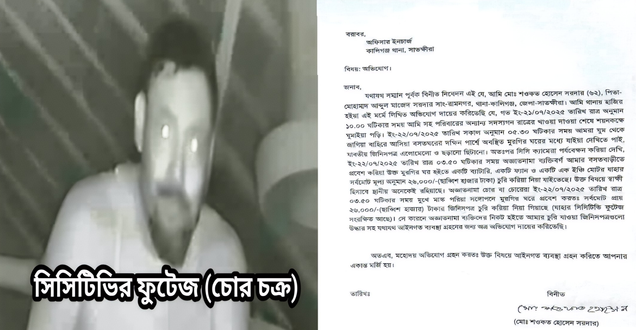 শিমুল হোসেন/সাতক্ষীরার কালিগঞ্জ উপজেলার ১ নং কৃষ্ণনগর ইউনিয়নের রামনগর গ্রামে গভীর রাতে একটি বাড়িতে চুরির ঘটনা ঘটেছে। বসতবাড়ির মুরগির ঘর থেকে প্রায় ২৬ হাজার টাকার মালামাল চুরি হয়। চুরির পুরো ঘটনাটি সিসিটিভি ক্যামেরায় ধরা পড়ে, যেখানে চোরদের মুখে মাস্ক পরা অবস্থায় দেখা গেছে।চুরির বিষয়ে লিখিত অভিযোগ দায়ের করে রামনগর গ্রামের আব্দুল মাজেদ সরদার এর ছেলে শওকত হোসেন সরদার (৬২) জানান, ২১ জুলাই ২০২৫ রাত আনুমানিক ১০টার দিকে পরিবারের সবাই রাতের খাবার শেষ করে ঘুমিয়ে পড়েন। ২২ জুলাই ভোর ৫টা ৩০ মিনিটের দিকে ঘুম থেকে উঠে বাড়ির দক্ষিণ পাশে অবস্থিত মুরগির ঘরে গিয়ে দেখতে পান, ঘরের জিনিসপত্র এলোমেলোভাবে ছড়ানো-ছিটানো।পরে বাড়ির সিসিটিভি ফুটেজ পর্যবেক্ষণ করে দেখা যায়, ২২ জুলাই রাত ৩টা ৫০ মিনিটে মুখোশধারী অজ্ঞাতনামা কয়েকজন চোর মুরগির ঘরে ঢুকে একটি ব্যাটারি, একটি ফ্যান এবং একটি এক ইঞ্চি পানির মোটর চুরি করে নিয়ে যায়। এসব মালামালের বাজারমূল্য আনুমানিক ২৬,০০০/- (ছাব্বিশ হাজার) টাকা বলে জানান তিনি।শওকত হোসেন আরও জানান, এ ঘটনার স্বাক্ষী হিসেবে স্থানীয় একাধিক ব্যক্তি রয়েছেন। তাই তিনি কালিগঞ্জ থানায় একটি লিখিত অভিযোগ দায়ের করেছেন এবং চুরি যাওয়া মালামাল উদ্ধারের জন্য প্রয়োজনীয় আইনগত ব্যবস্থা গ্রহণের অনুরোধ জানিয়েছেন।এ বিষয়ে কালিগঞ্জ থানার অফিসার ইনচার্জ (ওসি) মোঃ হাফিজুর রহমান সাংবাদিকদের জানান, “অভিযোগ হাতে পেয়েছি। বিষয়টি তদন্তাধীন রয়েছে। সিসিটিভি ফুটেজ যাচাই করে যথাযথ আইনগত ব্যবস্থা গ্রহণ করা হবে।