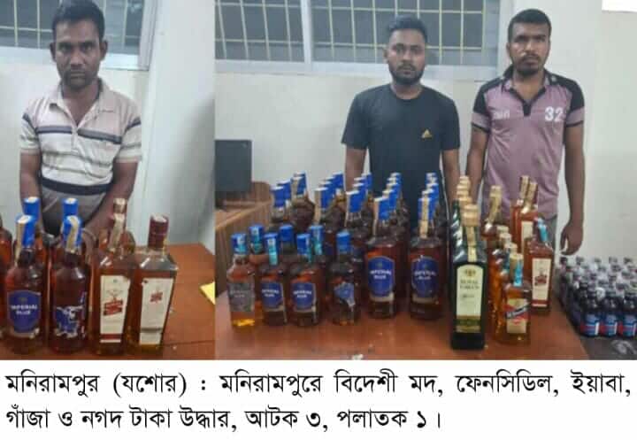 গোপন সংবাদের ভিত্তিতে কেশবপুর ও মনিরামপুর উপজেলায় কুখ্যাত মাদক ব্যবসায়ী আবু রায়হান (৩২) এর বাড়িতে অভিযান চালিয়ে ৯ বোতল বিদেশি মদ উদ্ধারের দাবি করেন গোয়েন্দারা। তার স্বীকারোক্তিতে অভিযান চালানো হয় সাগর গাজী (২৮) ও রাজু বৈরাগী (২৫) এর বাড়িতে। সেখানে আরও ৪৬ বোতল বিদেশি মদ ও ৩০ বোতল ফেনসিডিলসহ তাদের আটক করা হয়।