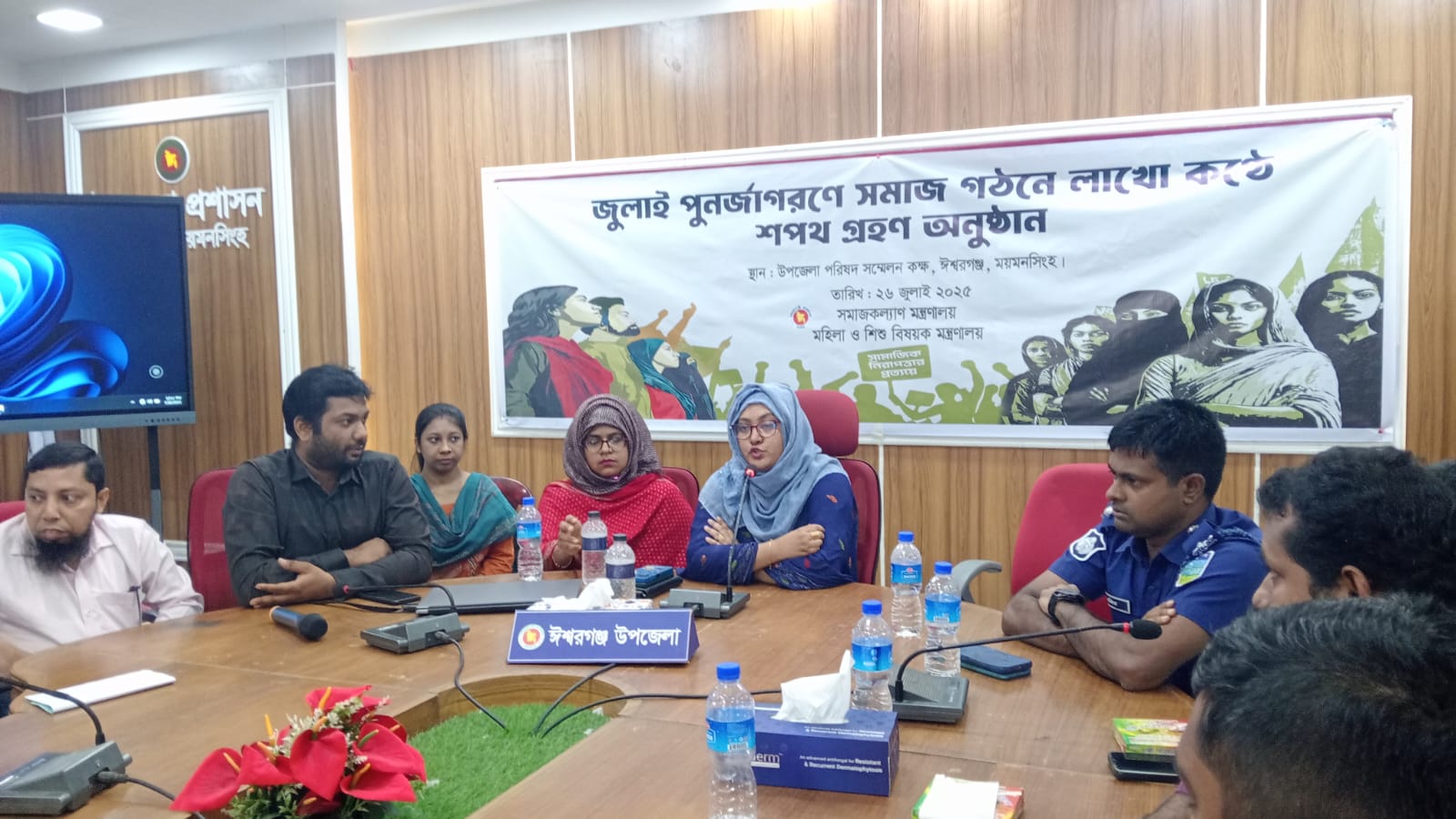 শাহ আলম কৌশিক/জুলাই পুনর্জাগরণে সমাজ গঠনে লাখো কণ্ঠে শপথ কর্মসূচির অংশ হিসেবে ময়মনসিংহের ঈশ্বরগঞ্জ উপজেলা সম্মেলন কক্ষে অনুষ্ঠিত হয়েছে শপথ গ্রহণ ও জনসেবামূলক কার্যক্রম।বৃহস্পতিবার (২৬ জুলাই) সকালে উপজেলা পরিষদ সম্মেলন কক্ষে সমাজসেবা কার্যালয় এবং উপজেলা মহিলা বিষয়ক কার্যালয়ের যৌথ আয়োজনে এবং উপজেলা নির্বাহী অফিসার কার্যালয়ের সার্বিক তত্ত্বাবধানে এ সেবা কার্যক্রম ও সাংস্কৃতিক অনুষ্ঠান অনুষ্ঠিত হয়েছে।অনুষ্ঠানের শুরুতেই ঢাকার কেন্দ্রীয় আয়োজনের সঙ্গে ভিডিও কনফারেন্সের মাধ্যমে সরাসরি যুক্ত হয় ঈশ্বরগঞ্জ উপজেলা প্রশাসন। সকাল ১০টায় পবিত্র ধর্মগ্রন্থ থেকে পাঠ ও জাতীয় সংগীত পরিবেশনার পর জুলাই শহীদদের স্মরণে ১ মিনিট নীরবতা পালন করা হয়। পরে ভিডিও কনফারেন্সের মাধ্যমে মাননীয় প্রধান উপদেষ্টার ভিডিও বার্তা প্রচার করা হয় এবং দেশব্যাপী একযোগে শপথ পাঠ অনুষ্ঠিত হয়।এ সময় সমাজসেবা মন্ত্রণালয় ও মহিলা বিষয়ক মন্ত্রণালয়ের আওতাধীন বিভিন্ন প্রকল্পের সুবিধাভোগীরা শপথ পাঠে অংশ নেন। শপথ পাঠের মাধ্যমে তাঁরা দেশ ও সমাজের প্রতি দায়িত্ব পালন, নৈতিকতা, মানবিকতা ও সামাজিক সচেতনতার বার্তা ছড়িয়ে দেন।শপথ গ্রহণ অনুষ্ঠানে উপস্থিত ছিলেন, উপজেলা নির্বাহী কর্মকর্তা (ইউএনও) সানজিদা রহমান, ঈশ্বরগঞ্জ উপজেলা বিএনপির সদস্য সচিব ও সাবেক ভাইস চেয়ারম্যান আমিরুল ইসলাম ভূঁইয়া মনি,অতিরিক্ত উপজেলা কৃষি কর্মকর্তা আব্দুল ওয়াহেদ খান,প্রাণীসম্পদ কর্মকর্তা, উপজেলা স্বাস্থ্য ও পরিবার পরিকল্পনা কর্মকর্তা, সহকারী কৃষি কর্মকর্তা, জামায়াতে ইসলামীর নেতা তানহা, সাংবাদিক, বৈষম্যবিরোধী ছাত্র আন্দোলনের নেতা হাসানুর রহমান সজিবসহ স্থানীয় গণ্যমান্য ব্যক্তিবর্গ।অনুষ্ঠানস্থলে উপজেলা পরিষদ চত্বরে স্থাপন করা হয় সমাজসেবা অধিদপ্তর ও মহিলা বিষয়ক অধিদপ্তরের সেবাবুথ। উপজেলা স্বাস্থ্য কমপ্লেক্সের উদ্যোগে সাধারণ মানুষকে বিনামূল্যে রক্ত পরীক্ষা,রক্তচাপ পরিমাপ এবং ডায়াবেটিস পরীক্ষা করা হয়। এতে অংশগ্রহণকারীরা সহজে স্বাস্থ্য পরীক্ষা করাতে পেরে উপস্থিত সেবা গ্রহীতারা বেশ উপকৃত হন।প্রথম পর্বের আনুষ্ঠানিকতা শেষে দ্বিতীয় পর্বে স্থানীয় শিল্পীদের অংশগ্রহণে হয় সাংস্কৃতিক অনুষ্ঠান।এই আয়োজনের মাধ্যমে ঈশ্বরগঞ্জে জনসচেতনতা, দায়িত্ববোধ এবং সরকারি সেবার সহজপ্রাপ্তি তিনটি বিষয়ই একসাথে ছড়িয়ে পড়ে জনগণের মাঝে।