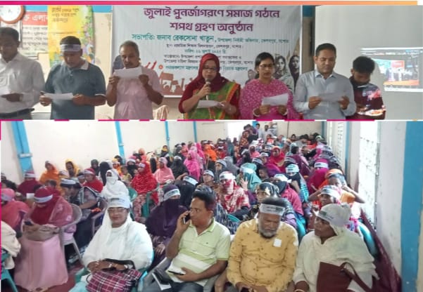 পরেশ দেবনাথ/কেশবপুরে জুলাই পুর্নজাগরণে সমাজ গঠনে লাখো কণ্ঠে শপথ গ্রহণ অনুষ্ঠান অনুষ্ঠিত হয়েছে।সমাজকল্যাণ মন্ত্রনালয়, মহিলা ও শিশু বিষয়ক মন্ত্রনালয়ের অধিক উপজেলা প্রশাসন, উপজেলা সমাজসেবা এবং উপজেলা মহিলা বিষয়ক কর্মকর্তা কার্যালয়ের যৌথ আয়োজনে পৌরশহরে প্রাথমিক শিক্ষক সমিতির মিলনায়তনে প্রায় তিন শতাধিক নারীর উপস্থিতিতে ওই শপথ গ্রহণ অনুষ্ঠিত হয়।শনিবার (২৬ জুলাই-২৫) সকালে অনুষ্ঠানে উপজেলা নির্বাহী অফিসার রেকসোনা খাতুন-এর সভাপতিত্বে এবং উপজেলা সমাজসেবা অফিসার মোঃ রোকনুজ্জামান-এর সঞ্চালনায় আলোচনা সভায় বক্তব্য রাখেন, উপজেলা বিএনপির সাধারণ সম্পাদক সহকারী অধ্যাপক আব্দুর রাজ্জাক, সদর ইউনিয়ন পরিষদের চেয়ারম্যান অধ্যাপক আলাউদ্দীন আলা, জাতীয় নাগরিক পার্টির কেশবপুরের প্রধান সমন্বয়ক সম্রাট হোসেন। স্বাগত বক্তব্য রাখেন, উপজেলা মহিলা বিষয়ক কর্মকর্তা রুপালী রানী।
