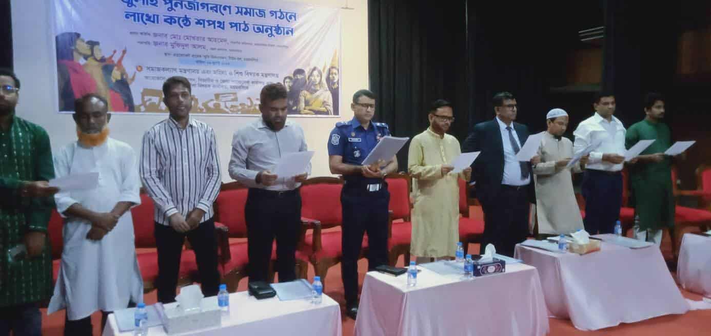 গোলাম কিবরিয়া পলাশ/ময়মনসিংহ জেলা প্রশাসন, বিভাগীয় ও জেলা সমাজসেবা কার্যালয় এবং মহিলা বিষয়ক অধিদপ্তরের জেলা কার্যালয়ের যৌথ আয়োজনে 'জুলাই পুনর্জাগরণে সমাজ গঠনে লাখো কন্ঠে শপথ পাঠ অনুষ্ঠান' আজ সকাল ১০টায় নগরীর অ্যাডভোকেট তারেক স্মৃতি অডিটোরিয়ামে অনুষ্ঠিত হয়েছে।ময়মনসিংহ জেলা প্রশাসক মুফিদুল আলম এর সভাপতিত্বে অনুষ্ঠানে প্রধান অতিথি হিসেবে উপস্থিত ছিলেন বিভাগীয় কমিশনার মোঃ মোখতার আহমেদ। শহীদদের আত্মত্যাগের ইতিহাস চিরস্মরণীয়। প্রশাসনের পক্ষ থেকে সবসময় সকল শহীদের পরিবারের প্রতি সহযোগিতা থাকবে। পরপারে মহান আল্লাহ রাব্বুল আলামীন তাদেরকে যেন ভালো রাখেন সেই দোয়া কামনা করি। বক্তব্যে প্রধান অতিথি এমন অভিব্যক্তি প্রকাশ করেন।এ সময় উপস্থিত ছিলেন পুলিশ সুপার কাজী আখতার উল আলম, বিভাগীয় সমাজসেবা কার্যালয়ের পরিচালক মোহাম্মদ গোলাম মোস্তফা, অতিরিক্ত জেলা প্রশাসক মোঃ আজিজুর রহমান, সদর উপজেলা নির্বাহী অফিসার মোঃ আরিফুল ইসলাম প্রিন্স, জেলা সমাজসেবা কার্যালয়ের উপপরিচালক রাজু আহমেদ।অনুষ্ঠানে সকল শহীদের আত্মার মাগফিরাত কামনায় মোনাজাত পরিচালনা করেন সমাজসেবা কার্যালয়ের ইমাম। সমাজকল্যাণ মন্ত্রণালয়ের উপদেষ্টা শারমীন এস মুরশিদ অনুষ্ঠানে ভার্চুয়ালি যুক্ত হয়ে বক্তব্য রাখেন। ভার্চুয়ালি সংযুক্ত হয়ে স্বাগত বক্তব্য রাখেন সমাজকল্যাণ মন্ত্রণালয়ের সচিব ড. মোঃ মহিউদ্দন।