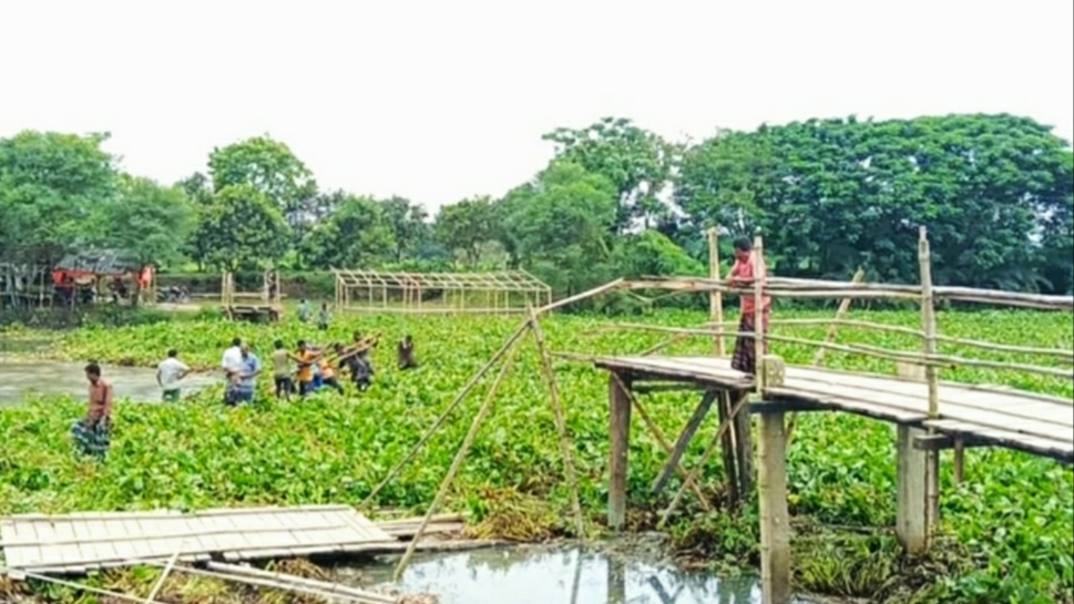 পরেশ দেবনাথ( নিজস্ব প্রতিনিধি)যশোরের কেশবপুর উপজেলার সাগরদাঁড়িতে মাইকেল মধুসূদন দত্তের স্মৃতি বিজড়িত কপোতাক্ষ নদের ওপর বাঁশের সাঁকোটি সম্প্রতি স্রোতের টানে উজান থেকে ভেসে আসা শ্যাওলার চাপে ভেঙে পড়েছে। এতে চরম দুর্ভোগে পড়েছেন দুই পাড়ের অন্তত ২০-২৫ গ্রামের মানুষ। প্রতিদিন দু-পারের শত শত মানুষ জীবনের ঝুকি নিয়ে নদের উপর জমে থাকা শেওলা উপর দিয়ে পারা-পার হচ্ছে। উপজেলা নির্বাহী অফিসার (ইউএনও) ঘটনাস্থল পরিদর্শন করে সাঁকোটি মেরামতের কথা জানিয়েছেন।সংশ্লিষ্ট সূত্রে জানা গেছে, মহাকবি মাইকেল মধুসূদন দত্তের জন্মস্থান সাগরদাঁড়িতে ব্রিজ না থাকায় দীর্ঘ ৫০ বছর ধরে কেশবপুর, তালা ও কলারোয়া উপজেলার হাজারও মানুষের চলাচলের একমাত্র মাধ্যম হয়ে ওঠে কপোতাক্ষ নদের বাঁশের সাঁকোটি। যার উপর দিয়ে প্রতিদিন কেশবপুরের সাগরদাঁড়ি, শেখপুরা, রেজাকাটি, বগা, মহাদেবপুর এবং তালা ও কলারোয়া উপজেলার সারসা, সরুলিয়া, সেনেরগাতি, ধানদিয়াসহ প্রায় ২৫ গ্রামের মানুষ চলাচল করে থাকেন। গত ২১ জুলাই সাঁকোটি ভেঙে যাওয়ায় দুর্ভোগে পড়েন এসব এলাকার মানুষ।সাগরদাঁড়িতে পর্যটন কেন্দ্রসহ রয়েছে কলেজ, মাধ্যমিক ও প্রাথমিক বিদ্যালয়। এ সব শিক্ষা প্রতিষ্ঠানে অসংখ্য ছাত্র-ছাত্রী, অভিভাবক, শিক্ষকসহ পথচারীদের চলাচলে বাঁশের সাকোটি ব্যবহার করতে হয়। এছাড়া, সপ্তাহের শনি, সোম ও বুধবার সাগরদাঁড়িতে হাট বসে। এ হাটে ওপারের কৃষকরা তাদের উৎপাদিত ফসল বেচাকেনা করে থাকেন। এ ছাড়া প্রতিদিন সাগরদাঁড়িতে অনেক পর্যটক আসেন। এ কারণেই বাঁশের সাঁকোটির গুরুত্ব অপরিসীম। এলাকার বাসিন্দা সাজ্জাত আলী জানান, সম্প্রতি অবিরাম বর্ষণে কপোতাক্ষ নদেও স্রোত অস্বাভাবিক ভাবে বেড়ে যায়। উজান থেকে নেমে আসা শেওলা ও কচুরিপানার চাপে সাঁকোটি ভেঙে নদে বিলীন হয়ে যায়। এতে দুই পারের হাজারও মানুষের চলাচল বন্ধ হয়ে যায়। সাগরদাঁড়ি বাজার কমিটির সাধারণ সম্পাদক রাজ্জাক আহমেদ রাজু বলেন, চলতি বছরের শুরুতে মধুকবির জন্মবার্ষিকী পালন উপলক্ষ্যে দুই উপজেলার মানুষের সহযোগিতায় স্বেচ্ছাশ্রমে বাঁশের সাঁকোটি মেরামত করা হয়েছিল। উজানের বিপুল পরিমাণে শেওলা আটকে সাঁকোটি আবারও ভেঙে পড়েছে। দীর্ঘ ৫০ বছর ধরে দু'পারের ২৫ গ্রামের মানুষের পারাপারের ভরসা হলো কপোতাক্ষ নদের ওপর ওই সাঁকোটি। কিন্তু সেটা ভেঙে যাওয়ায় বিপাকে পড়েছে দুপারের মানুষ। এলাকাবাসী দীর্ঘদিন একটি ব্রিজ নির্মাণের দাবি করে আসছেন। সাগরদাঁড়ি ইউনিয়ন বিএনপির সভাপতি আকরাম হোসেন বলেন, ওই স্থানে সেতু নির্মাণে ম্যাপসহ কারিগরি প্রতিবেদন তৈরি করে উপজেলা প্রকৌশলী দফতরের মাধ্যমে উর্ধ্বতন কর্তৃপক্ষের কাছে পাঠানো হয়েছে। সেতু নির্মাণে কোনো অগ্রগতি হয়নি। উপজ