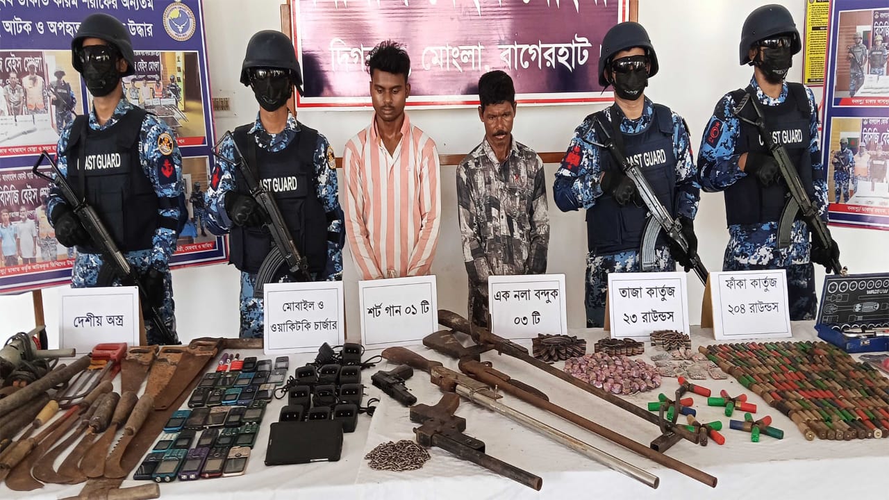 স্বপন কুমার রায় (খুলনা ব্যুরো প্রধান)কোস্ট গার্ডের অভিযানে অস্ত্র ও গোলাবারুদ সহ সুন্দর বনের দুর্ধর্ষ ডাকাত আসাবুর বাহিনীর -২ সহযোগীকে আটক করা হয়েছে।৬ আগষ্ট বুধবার সকালে কোস্টগার্ডের মিডিয়া কর্মকর্তা কমান্ডার সিহাম উল-হক এ তথ্য জানান।বুধবার (৬ আগস্ট) সকালে কোস্ট গার্ড মিডিয়া কর্মকর্তা লেফটেন্যান্ট কমান্ডার সিয়াম-উল-হক জানান, গোপন তথ্যের ভিত্তিতে জানা যায় সুন্দরবনের কুখ্যাত ডাকাত আসাবুর বাহিনীর সদস্যরা ডাকাতির উদ্দেশ্যে বনের শিবসা নদীর শরবতখালী এলাকায় অবস্থান করছে। সেই তথ্যের ভিত্তিতে মঙ্গলবার বিকেলে মোংলা কোস্ট গার্ড সদস্যরা ওই এলাকায় অভিযান চালান।আটকরা হলেন- মো. বাদশা গাজী (৪৫) ও মেহেদী হাসান (২৭)। তারা খুলনা জেলার পাইকগাছা থানার বাসিন্দা।