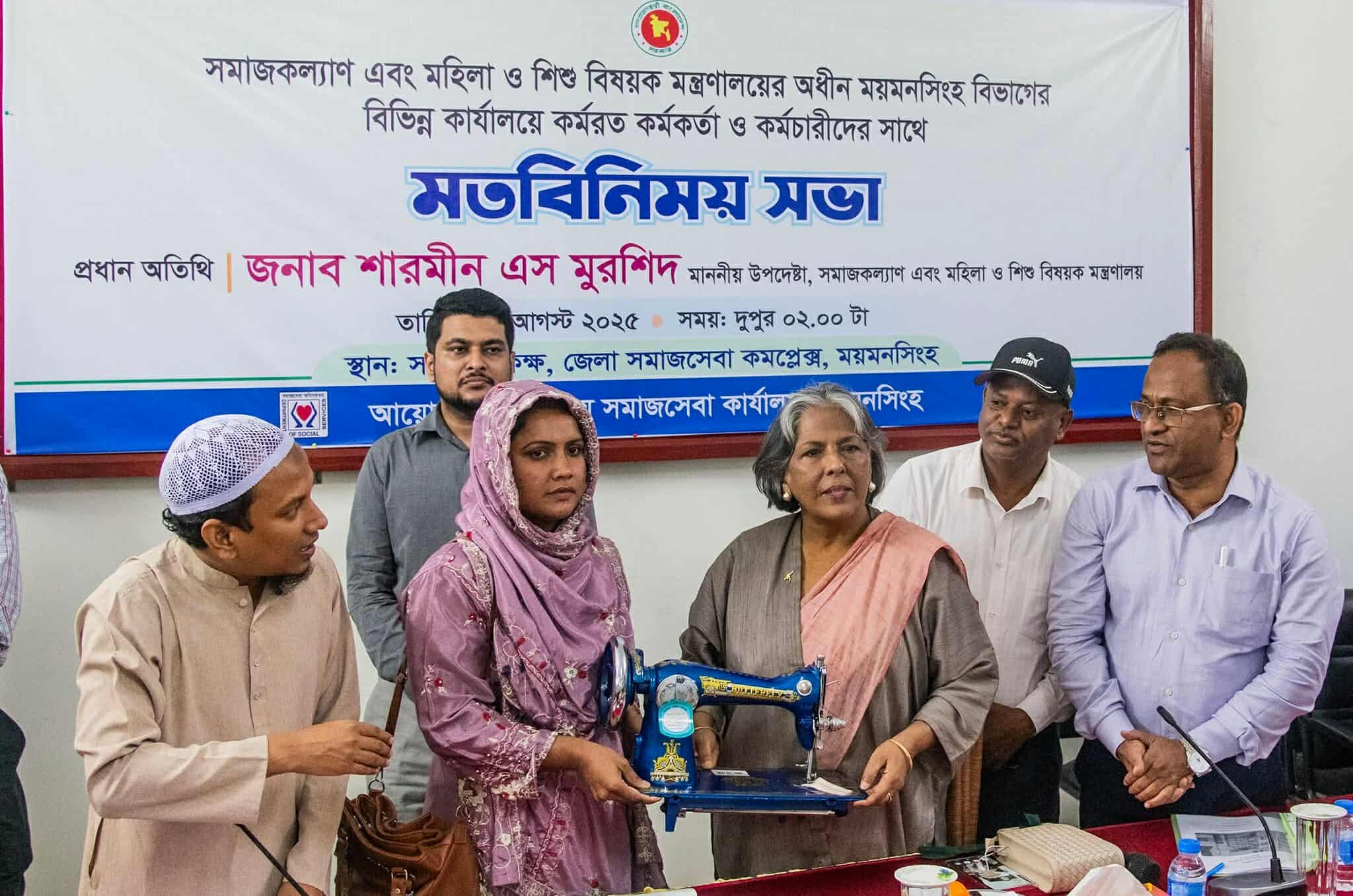 সমাজকল্যাণ এবং মহিলা ও শিশু বিষয়ক মন্ত্রণালয়ের উপদেষ্টা শারমীন এস মুরশিদ বলেছেন, প্রতিটি সেবা কার্যক্রম এমনভাবে পরিচালনা করতে হবে, যাতে সাধারণ মানুষ সহজেই সেই সেবার সুবিধা পায়। শহরের পাশাপাশি প্রত্যন্ত অঞ্চলের প্রতিটি মানুষ যেন তাদের প্রয়োজনীয় সেবা পান সেই লক্ষ্য নিয়েই আমাদের কাজ করতে হবে।ময়মনসিংহ বিভাগীয় সমাজসেবা কার্যালয় আয়োজিত আজ বুধবার (০৬ আগস্ট) বিকালে জেলার সমাজসেবা কমপ্লেক্সে সমাজকল্যাণ এবং মহিলা ও শিশু বিষয়ক মন্ত্রণালয়ের অধীন ময়মনসিংহ বিভাগের বিভিন্ন কার্যালয়ে কর্মরত কর্মকর্তা ও কর্মচারীদের সাথে মতবিনিময় সভায় প্রধান অতিথির বক্তব্যে তিনি এসব কথা বলেন।মতবিনিময় সভায় ময়মনসিংহ বিভাগীয় সমাজসেবা কার্যালয়ের পরিচালক মোহাম্মদ গোলাম মোস্তফা, জেলা সমাজসেবা কার্যালয়ের উপপরিচালক রাজু আহমেদ, চার জেলার উপপরিচালক, সহকারী পরিচালক, ময়মনসিংহ জেলা মহিলা ও শিশু বিষয়ক অধিদপ্তরের উপপরিচালক এবং বিভাগীয় ও জেলা পর্যায়ের কর্মকর্তা-কর্মচারীবৃন্দ উপস্থিত ছিলেন।তিনি আরো বলেন, সেবা প্রদানে জটিলতা বা বিলম্ব নয়, বরং মানুষের দোরগোড়ায় গিয়ে সেবা পৌঁছে দেওয়া আমাদের অঙ্গীকার। সেবা একটি পবিত্র কাজ, জনগণের জন্য কাজ করাকে যদি আমরা ইবাদতের অংশ হিসেবে দেখি, তাহলে আমাদের কাজের মান ও আন্তরিকতা আরও বৃদ্ধি পাবে।উপদেষ্টা বলেন, আমরা ইউনিয়ন লেভেলের কাজকে শক্তিশালী করতে চাই। তাই ইউনিয়ন লেভেলে সমাজসেবা কার্যক্রম, নারীর ক্ষমতায়ন, শিশু সুরক্ষা ও কল্যাণমূলক কার্যক্রমকে আরও সক্রিয় ও শক্তিশালী করে তুলতে হবে। সারা দেশের ন্যায় ময়মনসিংহের নারীরাও যাতে সমান সুযোগ পায় সে দিকে আমাদের লক্ষ্য থাকবে। তাই ময়মনসিংহ সমাজসেবা বিভাগ, মহিলা ও শিশু বিষয়ক অধিদপ্তরের কার্যক্রমকে আরো গতিশীল করার আহ্বান জানান তিনি।সভা শেষে প্রধান অতিথি শহর সমাজসেবা কার্যালয়ের অধীনে সমন্বয় পরিষদ কর্তৃক পরিচালিত দক্ষতা উন্নয়ন প্রশিক্ষণ কেন্দ্রের অধীনে তৃণমূল পর্যায়ের অসহায় প্রশিক্ষণ গ্রহীতা নারীদের মাঝে সেলাই মেশিন বিতরণ করেন।