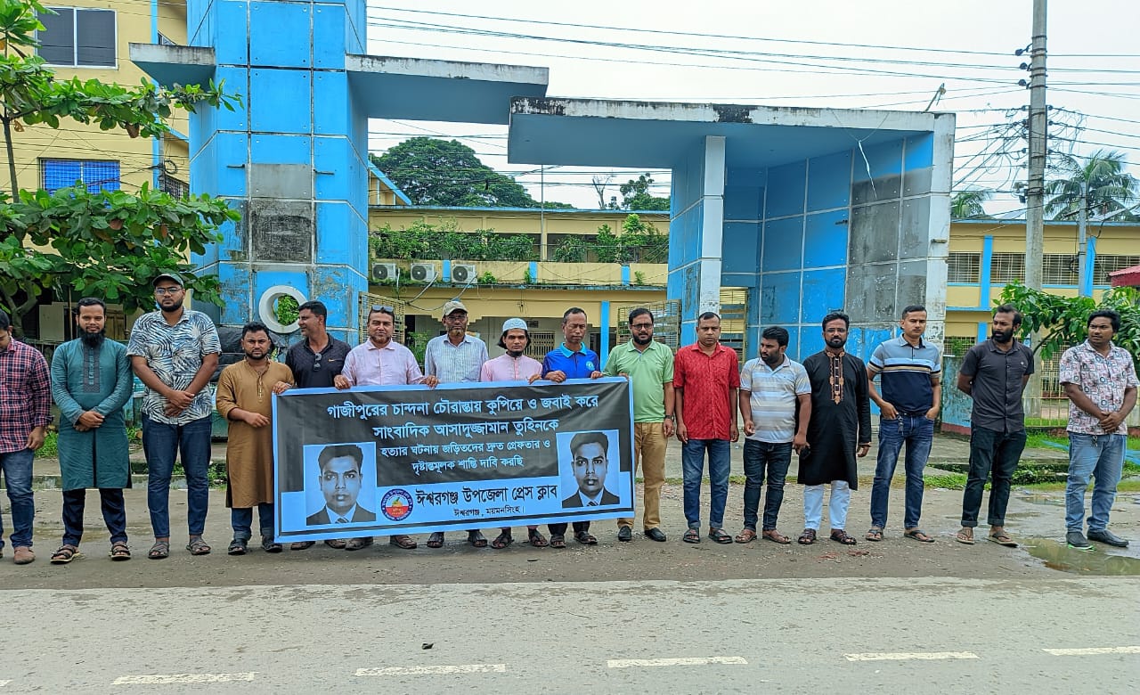 এ সময় উপস্থিত ছিলেন ঈশ্বরগঞ্জ উপজেলা প্রেস ক্লাবের সাধারণ সম্পাদক ও দৈনিক আলোকিত বাংলাদেশ প্রতিনিধি মো. ইসহাক, দৈনিক বিডি২৪ লাইভ প্রতিনিধি আব্দুল কাদির, দৈনিক আমার বার্তা প্রতিনিধি শাহ আলম কৌশিক, দৈনিক সময়ের কাগজ প্রতিনিধি মাহবুবুল আলম সোহাগ, দৈনিক জবাবদিহি প্রতিনিধি আসাদুল্লাহ হাদিস, দৈনিক আমার সংবাদ প্রতিনিধি হুসাইন মোহাম্মদ তারেক, দৈনিক বাংলাবাজার প্রতিনিধি মাহমুদুল হক শুভ, দৈনিক পাঞ্জেরি প্রতিনিধি ফয়সাল আহমেদ শাকিল, দৈনিক যুগের কণ্ঠস্বর প্রতিনিধি মো. আমিনুল ইসলাম, দৈনিক নিউজ ওয়াচ বিডি প্রতিনিধি মো. আশরাফুল আলম প্রমুখ।মানববন্ধনে বক্তারা বলেন, সাংবাদিকরা রাষ্ট্রের চতুর্থ স্তম্ভ হলেও বর্তমানে তারা নিরাপত্তাহীনতায় ভুগছেন। চাঁদাবাজ ও দুর্নীতিবাজদের বিরুদ্ধে সংবাদ প্রকাশ করলেই সাংবাদিকরা হামলা, মামলা, হুমকি ও হত্যার শিকার হচ্ছেন। গত বৃহস্পতিবার গাজীপুরের চান্দনা চৌরাস্তায় প্রকাশ্যে দিবালোকে চাপাতি-সজ্জিত সন্ত্রাসীরা সাংবাদিক আসাদুজ্জামান তুহিনকে যেভাবে নৃশংসভাবে কুপিয়ে ও জবাই করে হত্যা করেছে, তা নতুন কোনো ঘটনা নয়। এর আগে সাংবাদিক আনোয়ার হোসেনকে পুলিশের সামনেই হাত-পা থেঁতলে দিয়েছিল সন্ত্রাসীরা।বক্তারা তুহিন হত্যাকাণ্ডসহ সাংবাদিক সাগর-রুনি এবং দেশের সকল সাংবাদিকদের উপর হামলা-মামলা ও হত্যায় জড়িতদের দ্রুত গ্রেফতার ও দৃষ্টান্তমূলক শাস্তির দাবি জানান। একইসাথে এসব দাবি বাস্তবায়ন না হলে সারাদেশের সাংবাদিক সমাজকে নিয়ে বৃহত্তর আন্দোলনের হুঁশিয়ারি দেন তারা।