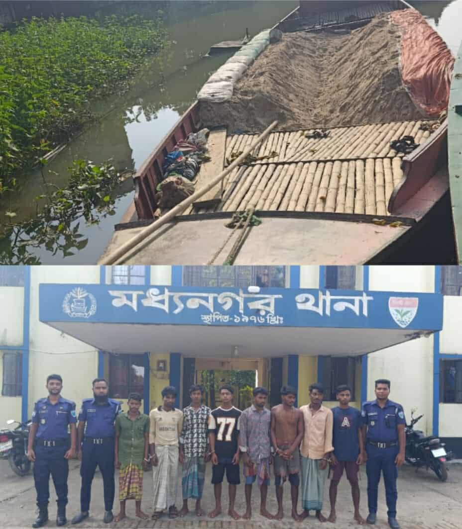 চয়ন চৌধুরী/সুনামগঞ্জের মধ্যনগরে অবৈধভাবে বালু উত্তোলনের দায়ে বালু বোঝাই একটি নৌকাসহ ৮ জন ব্যক্তিকে আটক করা হয়েছে।সোমবার দুপুর পৌনে ১২টার দিকে উপজেলা সদর ইউনিয়নের সম্পদপুর গ্রাম সংলগ্ন গফুরের খাল নামক স্থান থেকে অভিযান চালিয়ে বালু বোঝাই নৌকাটিসহ ওই ৮ জনকে আটক করে মধ্যনগর থানা পুলিশ।আটককৃত ব্যক্তিরা হলেন, তাহিরপুর উপজেলার রতনপুর গ্রামের গোলাপ মিয়ার ছেলে মো.তফছির হোসেন(২৬), ইউসুফ আলীর ছেলে মোনেকবর আলী(২০), জহর আলীর ছেলে মো. সম্রাট হোসেন(২১), আহাদ আলীর ছেলে মো. মফিজ আলী(২৫), নূরুল হকের ছেলে মো. মুক্তার আলী(১৯), শুক্কুর আলীর ছেলে মো.কাউছার আলী(২৩), শুক্কুর আলীর ছেলে শহর আলী(২০) ও একই উপজেলার কলাগাঁও গ্রামের আছিম উদ্দিনের ছেলে মো.শাহানুর(২০)।সোমবার বিকেল সাড়ে তিনটার দিকে মধ্যনগর থানার ভারপ্রাপ্ত কর্মকর্তা (ওসি) মো. মনিবুর রহমান এ ঘটনার সত্যতা নিশ্চিত করেছেন।পুলিশ সূত্রে জানা গেছে, আটককৃত ব্যক্তিরা দীর্ঘদিন যাবত একটি স্টিল বডি নৌকা দিয়ে মেঘালয় পাহাড় সীমান্তবর্তী এলাকা থেকে অবৈধভাবে বালু উত্তোলন করে তা নিজ এলাকাসহ পাশের ধর্মপাশা ও মোহনগঞ্জ উপজেলার বিভিন্ন এলাকায় নিয়ে বিক্রি করে আসছিল। এ অবস্থায় সোমবার দুপুরে উপজেলা সদর ইউনিয়নের সম্পদপুর গ্রাম সংলগ্ন গফুরের খাল নামক স্থান থেকে অভিযান চালিয়ে বালু বোঝাই নৌকাটিসহ ওই ৮ জন বালু উত্তোলনকারী ব্যক্তিকে আটক করে ওইদিন বিকেলেই তাদের বিরুদ্ধে থানায় একটি মামলা দায়েরের পর আদালতের মাধ্যমে তাদেরকে জেল-হাজতে পাঠানো হয়েছে।এ বিষয়ে মধ্যনগর থানার অফিসার ইনচার্জ (ওসি) মো. মনিবুর রহমান জানান, আটক ব্যক্তিদের নামে বালুমহাল ও মাটি ব্যবস্থাপনা আইনে পুলিশ বাদি হয়ে থানায় একটি মামলা দায়েরের পর ওইদিন বিকেলেই তাদেরকে আদালতের মাধ্যমে জেল-হাজতে পাঠানো হয়েছে। পাশাপাশি তাদের ৩০০ ঘনফুট অবৈধ বালু বোঝাই স্টিল বডি নৌকাটিও জব্দ করা হয়েছে।