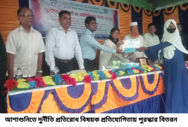 আব্দুর রশিদ/রুখবো দুর্নীতি গড়বো দেশ, হবে সোনার বাংলাদেশ" শ্লোগানকে সামনে রেখে আশাশুনিতে দুর্নীতি প্রতিরোধ বিষয়ক বিতর্ক ও রচনা প্রতিযোগিতা এবং পুরস্কার বিতরনী ও মতবিনিময় সভা অনুষ্ঠিত হয়েছে। বৃহস্পতিবার সকাল ১০ টা থেকে দিন ব্যাপী এ অনুষ্ঠানের আয়োজন করা হয়।দুর্নীতি দমন কমিশন সমন্বিত জেলা কার্যালয় খুলনা এর সার্বিক সহযোগিতায় উপজেলা দুর্নীতি প্রতিরোধ কমিটি আশাশুনির আয়োজনে অনুষ্ঠানে প্রধান অতিথি হিসাবে উপস্থিত ছিলেন, উপজেলা নির্বাহী অফিসার কৃষ্ণা রায়। বিশেষ অতিথি ছিলেন, দুদক সমন্বিত জেলা কার্যালয় খুলনার উপ সহকারী পরিচালক মোঃ মহসীন আলী ও উপজেলা মাধ্যমিক শিক্ষা অফিসের একাডেমীক সুপার ভাইজার মোঃ হাসানুজ্জামান। দুপ্রক সভাপতি চিত্তরঞ্জন ঘোষের সভাপতিত্বে ও সাধারণ সম্পাদক আজাদুল ইসলামের সঞ্চালনায় অনুষ্ঠানে আমন্ত্রিত অতিথি হিসাবে উপস্থিত ছিলেন, জেলা দুপ্রক সভাপতি আলহাজ্ব ডাঃ আবুল কালাম বাবলা, সাধারণ সম্পাদক মোঃ আনিছুর রহমান। অনুষ্ঠানে জেলা দুপ্রক সদস্য সাকিবুর রহমান ও আশাশুনি মাধ্যমিক বালিকা বিদ্যালয়ের প্রধান শিক্ষক মোস্তাফিজুর রহমান বক্তব্য রাখেন। দুপ্রক সহ সভাপতি রোকনুজ্জামান ও সহ সভাপতি জি এম মুজিবুর রহমান, সদস্য মমতাজ হেলেন, আল মামুন, রেহেনা খাতুন ও খুকুরানী উপস্থিত ছিলেন।বিতর্ক প্রতিযোগিতায় ১৬টি মাধ্যমিক বিদ্যালয়ের ১৬টি দল অংশ নেয়। যাদের মধ্যে শরাফপুর ইউনাইটেড মাধ্যমিক বিদ্যালয় দল প্রথম স্থান অধিকার করে। বিজীত দল আশাশুনি মাধ্যমিক বালিকা বিদ্যালয় দল। শ্রেষ্ঠ বক্তা নির্বাচিত হয়েছে বিজয়ী দলের দলনেতা রিফাত নূর। বিচারকের দায়িত্বে ছিলেন, প্রভাষক সজল আঢ্য (মডারেটর), প্রভাষক আক্তারুজ্জামান প্রিন্স ও প্রভাষক গোলাম কবির। রচনা প্রতিযোগিতায় ১১টি বিদ্যালয়ের ৫৫ জন প্রতিযোগি 'ক' ও 'খ' গ্রুপে বিভক্ত হয়ে অংশ নেয়। ক গ্রুপে কাদাকাটি স্কুলের কোয়েল গাইন প্রথম স্থান, গুনাকরকাটি স্কুলের মুমতাহিনা ২য় ও আশাশুনি মাধ্যমিক বালিকা বিদ্যালয়ের আকসা ইসলাম ৩য় স্থান এবং খ গ্রুপে আশাশুনি সরঃ মাধ্যমিক বিদ্যালয়ের মিলি মল্লিক ১ম, সুমনা খাতুন ২য় ও মাড়িয়ালা হাই স্কুলের কোয়েল মন্ডল ৩য় স্থান অধিকার করে। সবশেষে বিজয়ীদের মাঝে ক্রেস্ট, সনদ ও পুরস্কার বিতরন করা হয়।