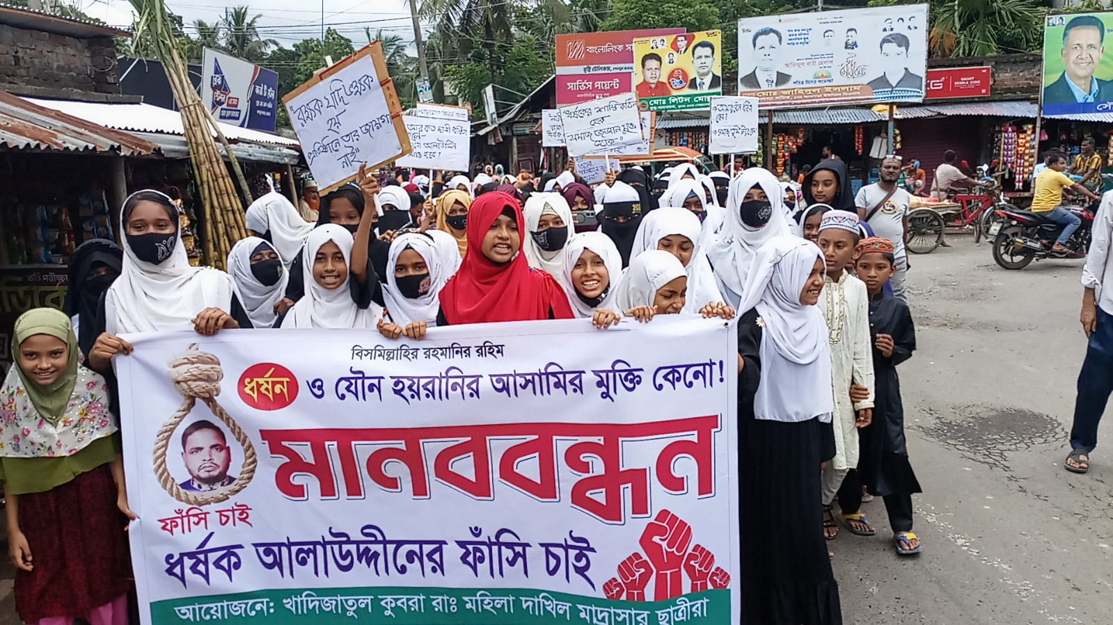 আজিজুল ইসলাম(স্টাফ রিপোর্টার)তেরখাদায় খাদিজাতুল কুবরা রাঃ মহিলা দাখিল মাদ্রাসার শিক্ষক আলাউদ্দিন শিকদারের ফাঁসির দাবীতে ১৪ আগস্ট সকালে শেখপুরা বাজারে মানববন্ধন ও বিক্ষোভ মিছিল অনুষ্ঠিত হয়। মানববন্ধনে বক্তৃতা কালে বক্তারা বলেন ইউনিয়ন আওয়ামী লীগের ধর্ম বিষয়ক সম্পাদক, ধর্ষন ও যৌন হয়রানি মামলাম আসামি আলাউদ্দিনকে মাদ্রাসায় পুনর্বহাল করলে মাদ্রাসায় তালা জুলিয়ে সকল নারী শিক্ষার্থীরা প্রতিষ্ঠান ত্যাগ করে অন্যত্র চলে যাওয়ার হুশিয়ারি প্রদান করেন। অপরদিকে ভুক্তভোগী ছাত্রির মাতা ধর্ষণ মামলার বাদী ছাত্রীদের সাথে তাল মিলিয়ে একই শুরে বলেন চরিত্রহীন আলাকে মুক্তি কেন দেওয়া হলো। আলাউদ্দিন ইতিপূর্বে একাদিক ছাত্রীর সাথে অসৌজন্যমূলক আচরণ করেছে এবং আলাউদ্দিনের পূর্বে স্ত্রী সন্তান থাকা সত্ত্বেও উক্ত প্রতিষ্ঠানের অষ্টম শ্রেণিতে পড়ুয়া এক ছাত্রীকে জোরপূর্বক বিবাহ করেছে। শত শত কোমলমতি শিক্ষার্থী এবং অভিভাবক গনের একই দাবী আলাউদ্দিনের কাছে কোন ছাত্রী নিরাপদ নয় অতএব আলাউদ্দিনের ফাসীছাই। অত্র মাদ্রাসার ছাত্রীরা আয়োজিত মানববন্ধনের সভাপতিত্ব করেন মাদ্রাসা সুপার মোঃ মোজাহিদুল ইসলাম৷ বক্তৃতা করেন মাদ্রাসার সহ-সুপার আব্দুস সালাম জাহেদি,সমাজসেবক মোস্তফা শেখ, মাদ্রাসার সহকারী শিক্ষক মোঃ ইকবাল হোসেন, তছিরুননেছা, আসমা আক্তার, মাহমুদা খাতুন, মাজাহারুল ইসলাম, মোস্তফা কামাল, রাসেল আলম, রিনা খানম, মাদ্রাসা শিক্ষার্থী মুর্শীদা,আইরিন আক্তার, আদরি আক্তার, ফারজানা খানম, ঐশি আক্তার, জান্নাতুল ফেরদৌস, মারিয়া সুলতানা মিথি, মিম্মা আক্তার, নাঈম নিশাদ, তানহা, লামিয়া, মহিমা, অধোরা, মরিয়ম,শিক্ষার্থীদের অভিভাবক রুনা বেগম, জেসমিন আক্তার, রতনা, ফারজানা, সাফমিদা, খাদিজা, নাজমিন প্রমূখ।ভূক্তভোগীর পিতা ও মাতা উপস্থিত ছিলেন। উল্লখ্যে আলাউদ্দিনের বিরুদ্ধে ২০২৪ সালের ২০ নভেম্বর মাদ্রাসার তৃতীয় শ্রেনীর এক ছাত্রীকে ধর্ষণ করার অভিযোগ উঠে। পরবর্তীতে ধর্ষীতার মাতা তার বিরুদ্ধে তেরখাদা থানায় বাদী হয়ে মামলা দায়ের করলে তাকে পুলিশ তআটক করে কোর্ট হাজতে প্রেরণ করে। পরবর্তীতে সকল স্বাক্ষী ও আলামত আলাউদ্দিনের বিপক্ষে থাকা সত্বেও মামলা থেকে খালাস পেয়ে এই প্রতিষ্ঠানে পুনর্বহালের চেষ্টা করলে এই মানববন্ধন অনুষ্ঠিত হয়।