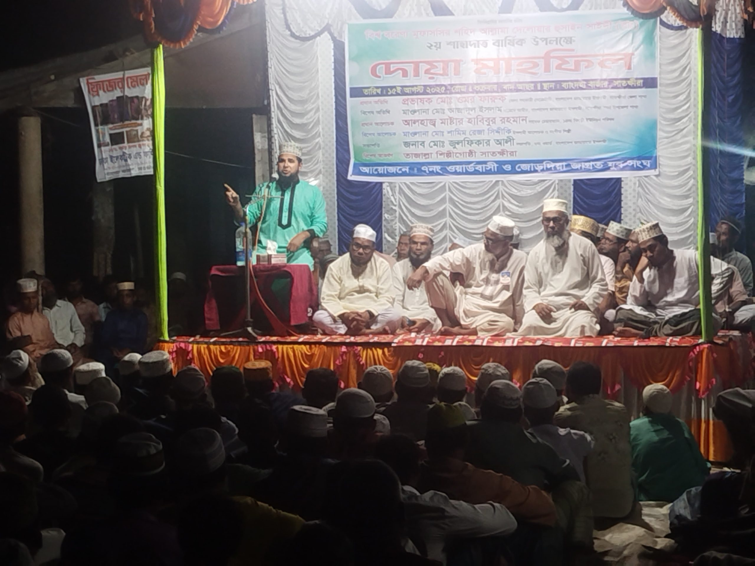 আব্দুর রশিদ /বিশ্ব বরেণ্য মুফাসসির শহীদ আল্লামা দেলোয়ার হোসাইন সাঈদীর দ্বিতীয় শাহাদাত বার্ষিকী উপলক্ষে গত শুক্রবার ১৫ ই আগস্ট, সন্ধ্যা থেকে রাত্র ১১ টা পুজন্ত চলে। সাতক্ষীরার ব্যাংদহা বাজারে এক দোয়া মাহফিল অনুষ্ঠিত হয়েছে। এই মাহফিলে বিপুল সংখ্যক ধর্মপ্রাণ মুসলমান অংশ নেন।অনুষ্ঠানের আয়োজন করেন সাত নাম্বার ওয়ার্ডবাসী ও জোড়দিয়া জাগ্রত যুব সংঘ। মাহফিলে প্রধান অতিথি হিসেবে উপস্থিত ছিলেন বাংলাদেশ জামায়াতে ইসলামী সাতক্ষীরা জেলা শাখার সহকারী সেক্রেটারি প্রভাষক মোঃ ওমর ফারুক। তিনি তাঁর বক্তব্যে আল্লামা সাঈদীর জীবন ও কর্মের ওপর আলোকপাত করেন এবং ইসলামের প্রসারে তাঁর অবদান স্মরণ করেন।বিশেষ অতিথি হিসেবে উপস্থিত ছিলেন বাংলাদেশ জামায়াতে ইসলামী সাতক্ষীরা সদর উপজেলা শাখার নায়েবে আমীর মাওলানা মোঃ আজাদুল ইসলাম। প্রধান আলোচক হিসেবে উপস্থিত ছিলেন ১৪নং ফিংড়ী ইউনিয়ন পরিষদের সাবেক চেয়ারম্যান আলহাজ্ব মাস্টার হাবিবুর রহমান। তিনি আল্লামা সাঈদীর আধ্যাত্মিক এবং জ্ঞানভিত্তিক আলোচনায় তুলে ধরেন। বিশেষ আলোচক ছিলেন ইসলামী আলোচক ও সংগীত শিল্পী মাওলানা মোঃ শামীম রেজা সিদ্দিকী।অনুষ্ঠানে সভাপতিত্ব করেন বাংলাদেশ জামায়াতে ইসলামী, সাত নাম্বার ওয়ার্ডের সভাপতি মোঃ জুলফিকার আলী। সভাপতির বক্তব্যে তিনি আল্লামা সাঈদীর আদর্শকে ধারণ করে ইসলামের পথে অবিচল থাকার আহ্বান জানান।মাহফিলের বিশেষ আকর্ষণ ছিল তাজাল্লা শিল্পীগোষ্ঠী, সাতক্ষীরার মনোমুগ্ধকর ইসলামিক সংগীত পরিবেশনা। তাদের পরিবেশনায় উপস্থিত সবাই মুগ্ধ হন। পরিশেষে, আল্লামা সাঈদীর রূহের মাগফিরাত কামনা করে বিশেষ দোয়া করা হয়। দোয়া শেষে দেশ ও জাতির কল্যাণ কামনা করা হয়।