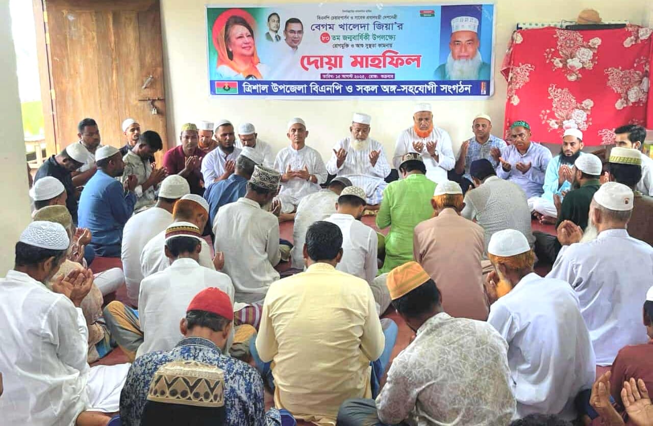 মোঃ আসাদুল ইসলাম মিন্টু/বিএনপি'র চেয়ারপার্সন ও সাবেক প্রধানমন্ত্রী দেশনেত্রী বেগম খালেদা জিয়ার ৮০তম জন্মবার্ষিকী উপলক্ষ্যে রোগ মুক্তি ও আশু সুস্থতা কামনায় ময়মনসিংহের ত্রিশালে কুরআনখানী মিলাদ ও দোয়া মাহফিল অনুষ্ঠিত হয়েছে।দিবসটি উপলক্ষে ত্রিশাল উপজেলা বিএনপি ও সকল অঙ্গ-সহযোগী সংগঠনের যৌথ উদ্যোগে শুক্রবার বাদ জুম্মা জামিয়া সাওতুল হেরা মাদরাসায় কুরআন খতম, মিলাদ ও দোয়া মাহফিলে প্রধান অতিথি হিসেবে উপস্থিত ছিলেন ময়মনসিংহ-৭ (ত্রিশাল) সংসদীয় আসনে ধানের শীষের মনোনয়ন প্রত্যাশী উপজেলা পরিষদের সাবেক চেয়ারম্যান ও উপজেলা বিএনপি'র সাবেক সাধারণ সম্পাদক আলহাজ্ব মোঃ জয়নাল আবদীন।সাখুয়া ইউনিয়ন বিএনপি সাবেক সভাপতি ও সাবেক ইউপি চেয়ারম্যান শাহ মোহাম্মদ গোলাম ইয়াহিয়া এর সভাপতিত্বে বিশেষ অতিথি হিসেবে উপস্থিত ছিলেন, উপজেলা বিএনপির সাবেক সাংগঠনিক সম্পাদক ও সাবেক ইউপি চেয়ারম্যান জাহিদ আমিন, উপজেলা বিএনপির সাবেক সহ-সাংগঠনিক সম্পাদক অধ্যাপক গোলাম ফারুক স্বপন প্রমুখ।আলোচনা শেষে বিএনপি'র চেয়ারপার্সন ও সাবেক প্রধানমন্ত্রী দেশনেত্রী বেগম খালেদা জিয়ার ৮০তম জন্মবার্ষিকী উপলক্ষ্যে রোগ মুক্তি ও আশু সুস্থতা কামনায় মোনাজাত পরিচালনা করা হয়।