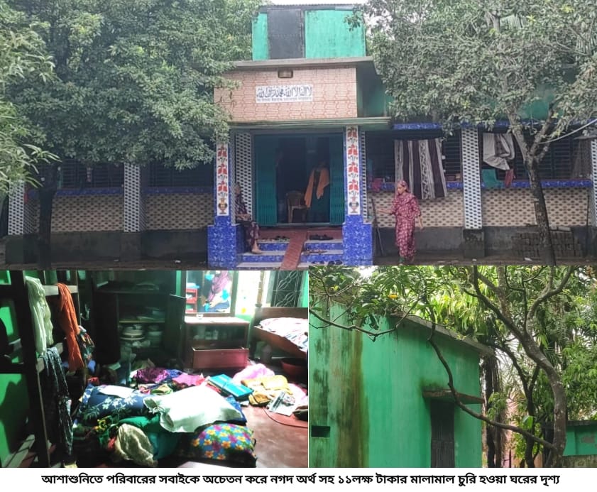 সকালে স্থানীয়দের সহায়তায় আমার দাদী কোহিনুর বেগম (৬০) চাচা মনিরুল ইসলাম ও চাচী আসমা খাতুনকে অচেতন অবস্থায় উদ্ধার করে তাদের আশাশুনি উপজেলা স্বাস্থ্য কমপ্লেক্সে চিকিৎসাধীন রাখা হয়েছে।মুক্তিযোদ্ধার বড় মেয়ে খাস বাগান গ্রামের পুতুল ও মিম জানান, ঘরের আলমারি ভেঙে নগদ ৯৫ হাজার টাকা ও স্বর্ণের রুলি, চেইন, নেকলেস, ঝুমকা সহ অন্যান্য প্রায় ১১ লক্ষ টাকার স্বর্ণালংকার নিয়ে গেছে।প্রাথমিক ভাবে ধারণা করা হচ্ছে, বাড়ির পিছনের আম গাছে উঠে ছাদে নেমে ঘরের ভেতর ঢুকে চেতনা নাশক স্প্রে করে সবাইকে অচেতন করে দুর্বৃত্তরা। মিমের ঘরে ঢুকতে না পেরে সে রক্ষা পেয়েছে।২০২৩ সালের ডিসেম্বর মাসে ওই বাড়ির গোয়াল ঘরে থাকা ৬গরু চুরি হয়েছিল বলে জানান প্রতিবেশীরা।এ ব্যাপারে আশাশুনি থানা অফিসার ইনচার্জ সামছুল আরেফিন জানান, চুরির ঘটনা জানতে পেরে এসআই অনাথ মিত্র ও এসআই ফয়সালকে ঘটনাস্থলে পাঠানো হয়েছে। এখনও কেউ লিখিত অভিযোগ করেননি। অভিযোগ পেলে ব্যবস্থা নেয়া হবে।