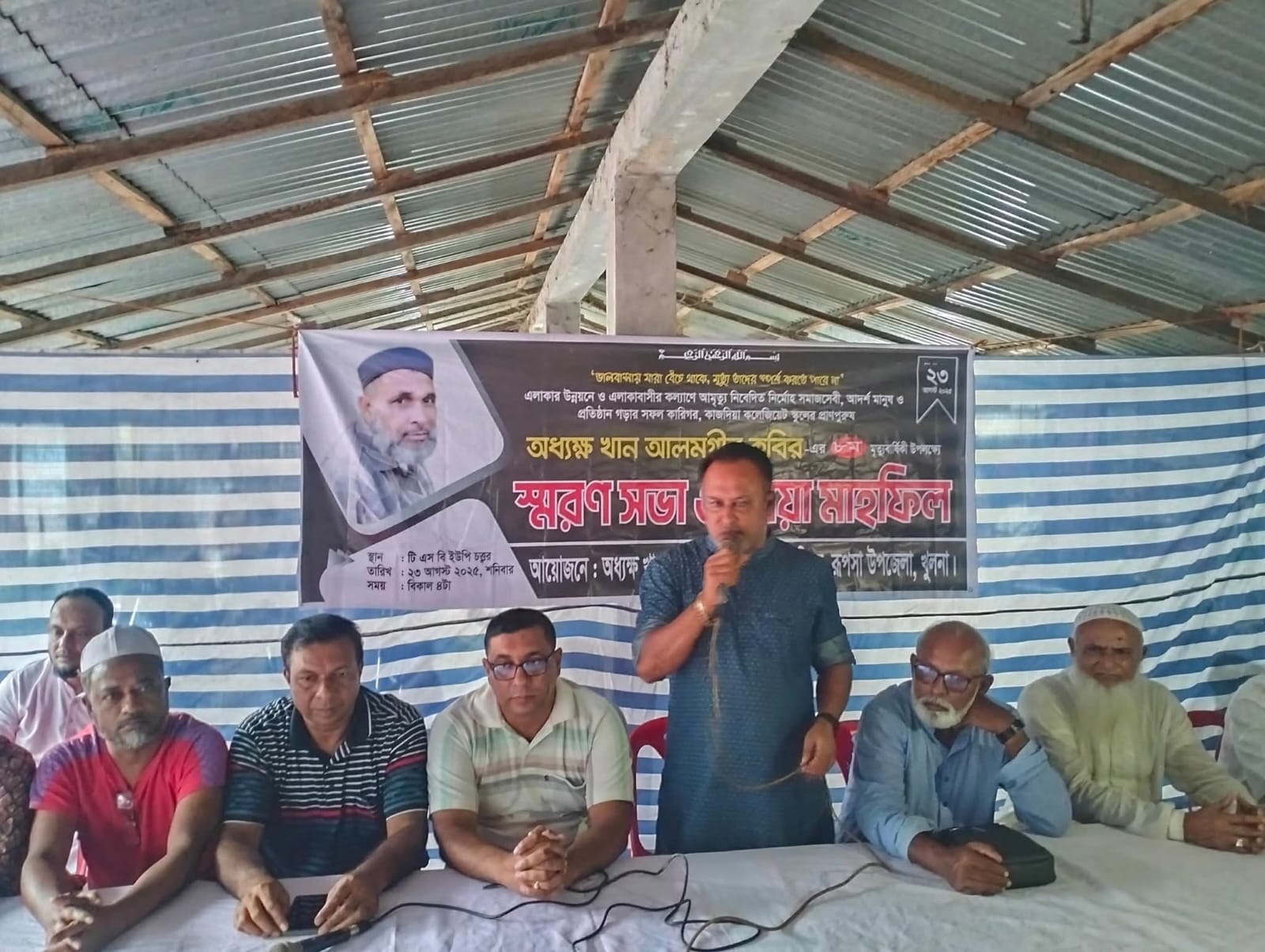 আজিজুল ইসলাম(স্টাফ রিপোর্টার)অধ্যক্ষ খান আলমগীর কবির আমৃত্যু মানুষের কল্যানে কাজ করে গেছেন। তিনি আদর্শ মানুষ ও প্রতিষ্ঠান গড়ার সফল কারিগর। কাজদিয়া কলেজিয়েট স্কুলে মানসম্মত শিক্ষা ব্যবস্থা ব্যবস্থা করতে তিনি বিশেষ অবদান রেখেছেন। তার শূন্যতা পূরণ হবার নয়।শনিবার (২৩ আগস্ট) বিকালে খুলনার রূপসা উপজেলার ৪নং টিএসবি ইউনিয়ন পরিষদ চত্বরে অধ্যক্ষ খান আলমগীর কবির স্মৃতি পরিষদের আয়োজনে তার ৮ম মৃত্যুবার্ষিকী উপলক্ষ্যে আয়োজিত স্মরণ সভা ও দোয়া মাহফিল অনুষ্ঠানে বক্তারা এসব কথা বলেন।ফকিরহাট কলেজের অবসার প্রাপ্ত অধ্যক্ষ খাইরুল আলম লাভলুর সভাপতিত্বে ও প্রভাষক মেজবাহ উদ্দিন খানের সঞ্চলনায় বক্তব্য রাখেন জেলা বিএনপির যুগ্ম আহবায়ক জিএম কামরুজ্জামান টুকু, রূপসা উপজেলা বিএনপির সিনিয়র যুগ্ম আহবায়ক বিকাশ মিত্র, খুলনা সরকারি মহিলা কলেজের সহকারী অধ্যাপক আহমেদুল কবির চাইনিজ, ৪নং টিএসবি ইউনিয়ন বিএনপির সাবেক আহবায়ক খান আনোয়ার হোসেন, জামায়াতে ইসলামী টিএসবি ইউনিয়ন শাখার আমির অধ্যাপক মোঃ আসাদুজ্জামান, হাফেজ মো: জাহাঙ্গীর ফকির, সমাজসেবক হাজী মো: সাইফুল ইসলাম, ওমর ফারুক, মোঃ মোস্তাকুজ জামান, যুবদল নেতা মুন্না সরদার, সৈয়দ নিয়ামত আলী, শিক্ষক সামছুর রহমান, বলরাম আঁশ প্রমুখ, আলতাফ মাহমুদ প্রমুখ।