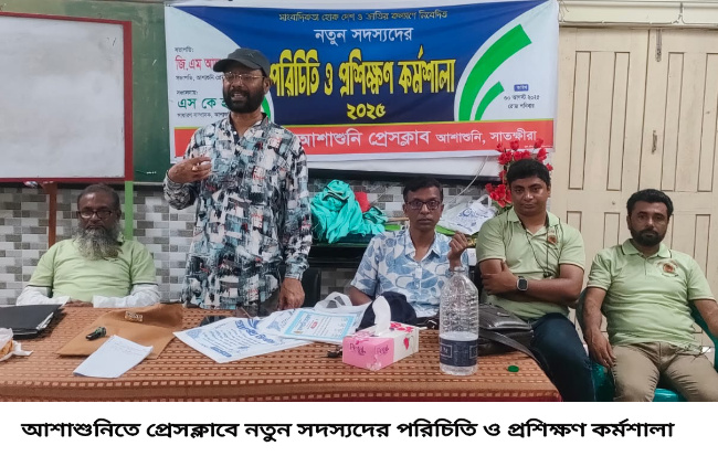 আব্দুর রশিদ/আশাশুনি প্রেস ক্লাবে নতুন সদস্যদের পরিচিতি ও সাংবাদিকদের প্রশিক্ষণ কর্মশালা অনুষ্ঠিত হয়েছে। শনিবার (৩০ আগস্ট) সকাল ১০ টায় উপজেলা রিসোর্স সেন্টারের প্রশিক্ষণ মিলনায়নতে এ কর্মশালার আয়োজন করা হয়।আশাশুনি প্রেস ক্লাবের আয়োজনে পরিচিতি অনুষ্ঠানে সভাপতিত্ব করেন, প্রেস ক্লাবের সভাপতি জি এম আল ফারুক। সাধারণ সম্পাদক এস কে হাসানের সঞ্চালনায় সভায় অতিথি হিসাবে আলোচনা রাখেন, থানার ভারপ্রাপ্ত কর্মকর্তা সামসুল আরেফিন। প্রধান আলোচক ছিলেন, দৈনিক প্রথম আলো ও ডেইলী স্টারের স্টাফ রিপোর্টার কল্যান ব্যানার্জী। সভায় প্রতিষ্ঠাতা সভাপতি জি এম মুজিবুর রহমান, সাবেক সভাপতি এস এম আহসান হাবিব, সাবেক সাধারণ সম্পাদক সমীর রায়, সহ সভাপতি সচ্চিদানন্দদে সদয়, নতুন সদস্য রাবিদ মাহমুদ চঞ্চল ও ইসমাইল হোসেনসহ নতুন ও পুরাতন সদস্য ও কর্মকর্তাবৃন্দ উপস্থিত ছিলেন।দ্বিতীয় পর্বে "গণ মাধ্যমের অপ সাংবাদিকতা প্রতিরোধ ও বস্তুনিষ্ঠ সংবাদ পরিবেশন" শীর্ষক প্রশিক্ষণ কর্মশালা অনুষ্ঠিত হয়। প্রশিক্ষণ প্রদান করেন, দৈনিক প্রথম আলো ও ডেইলী স্টারের স্টাফ রিপোর্টার কল্যান ব্যানার্জী, দৈনিক ইনকিলাব ও দৈনিক পূর্বাঞ্চলের আশাশুনি প্রতিনিধি জি এম মুজিবুর রহমান। ফটো সাংবাদিকতা বিষয়ে প্রশিক্ষণ প্রদান করেন, প্রথম আলোর প্রাক্তন ফটো সাংবাদিক ও আশাশুনি থানার অফিসার ইনচার্জ সামসুল আরেফিন। প্রশিক্ষণ কর্মশালা শেষে অংশ গ্রহনকারীদের হাতে সনদ তুলে দেন অতিথিবৃন্দ। তৃতীয় পর্বে প্রেস ক্লাবের সাবেক ২ সদস্য মাসুদুর রহমান ও শাহাদৎ হোসেন টিটলকে সরকারি চাকুরী জনিত কারনে এবং গোপাল কুমার মন্ডল জেলা প্রেস ক্লাবে সদস্য হওয়ায় বিদায় সংবর্ধনা প্রদান করা হয়।