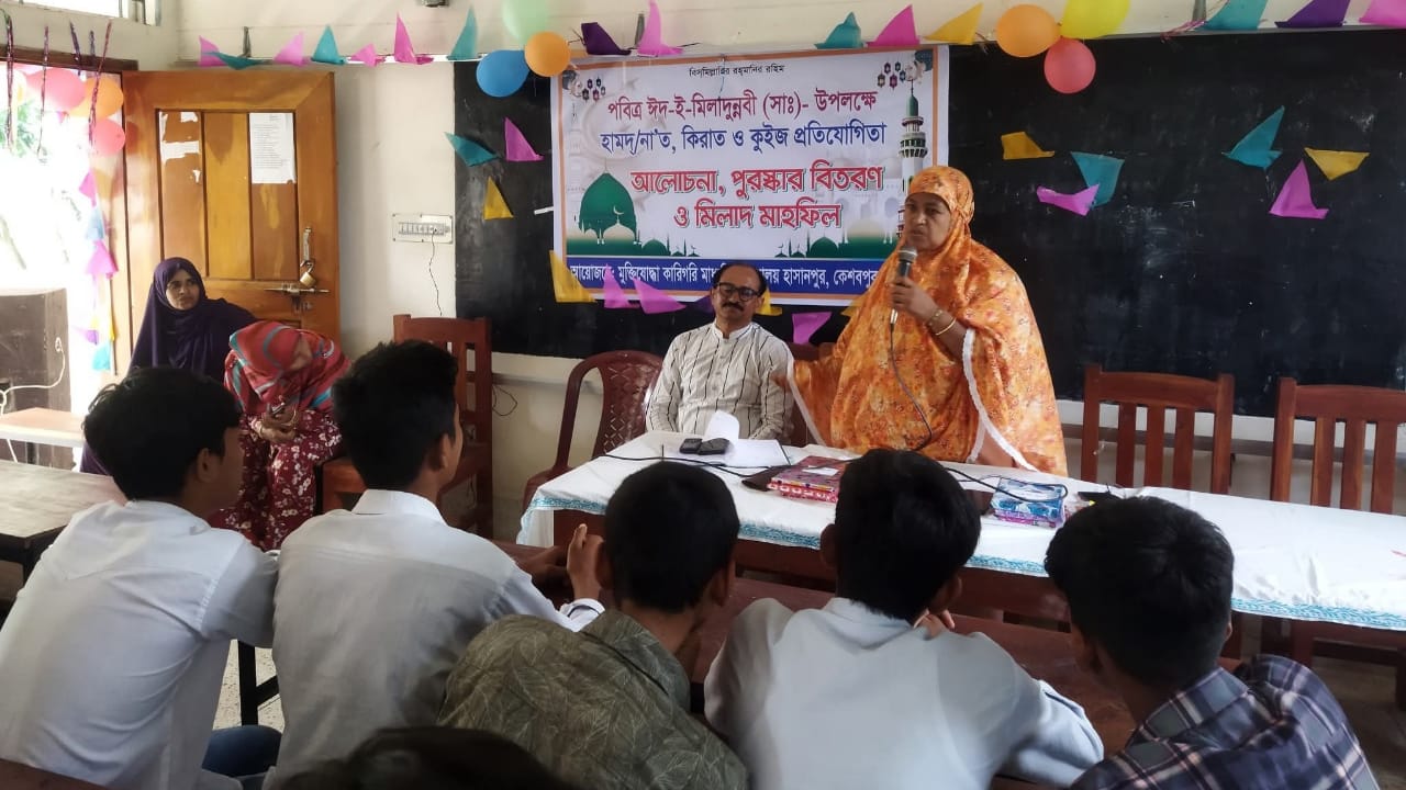 পরেশ দেবনাথ(নিজস্ব প্রতিনিধি)কেশবপুর মুক্তিযোদ্ধা কারিগরি মাধ্যমিক বিদ্যালয়ে নানা আনুষ্ঠানিকতার মধ্য দিয়ে পবিত্র ঈদ-ই- মিলাদুন্নবী (সাঃ)- উপলক্ষে হামদ্/না'ত/কিরাত ও কুইজ প্রতিযোগীতা, আলোচনা, পুরস্কার বিতরণ ও মিলাদ মাহফিল অনুষ্ঠিত হয়েছে।বৃহস্পতিবার (১১ সেপ্টেম্বর-২৫) বিদ্যালয়ের হল রুমে অনুষ্ঠানে সুপারিনটেনডেন্ট সামছুন নাহার-এর সভাপতিত্বে এবং এসকে আব্দুর রহিম-এর সঞ্চালনায় আলোচনা করেন, শিক্ষক আজিজুল ইসলাম, আশরাফুজ্জামান, গোবিন্দ কুমার দাস, শাহানা পারভীন, আমিরুল ইসলাম, শুভাশিষ দত্ত প্রমূখ।অনুষ্ঠান উপস্থিত ছিলেন, আবুজার গিফারী, রাশেদুল ইসলাম, মামুন হোসেন, সাংবাদিক আব্দুল মোমিন, জিয়াউর রহমান, ফজলুর রহমান, ফারুক হোসেন প্রমুখ। দোয়া পরিচালনা করেন, মাওলানা আবুজার গিফারী। বিভিন্ন প্রতিযোগীতায় অংশগ্রহণকারী শিক্ষার্থীদের মাঝে পুরস্কার বিতরণ করা হয়।