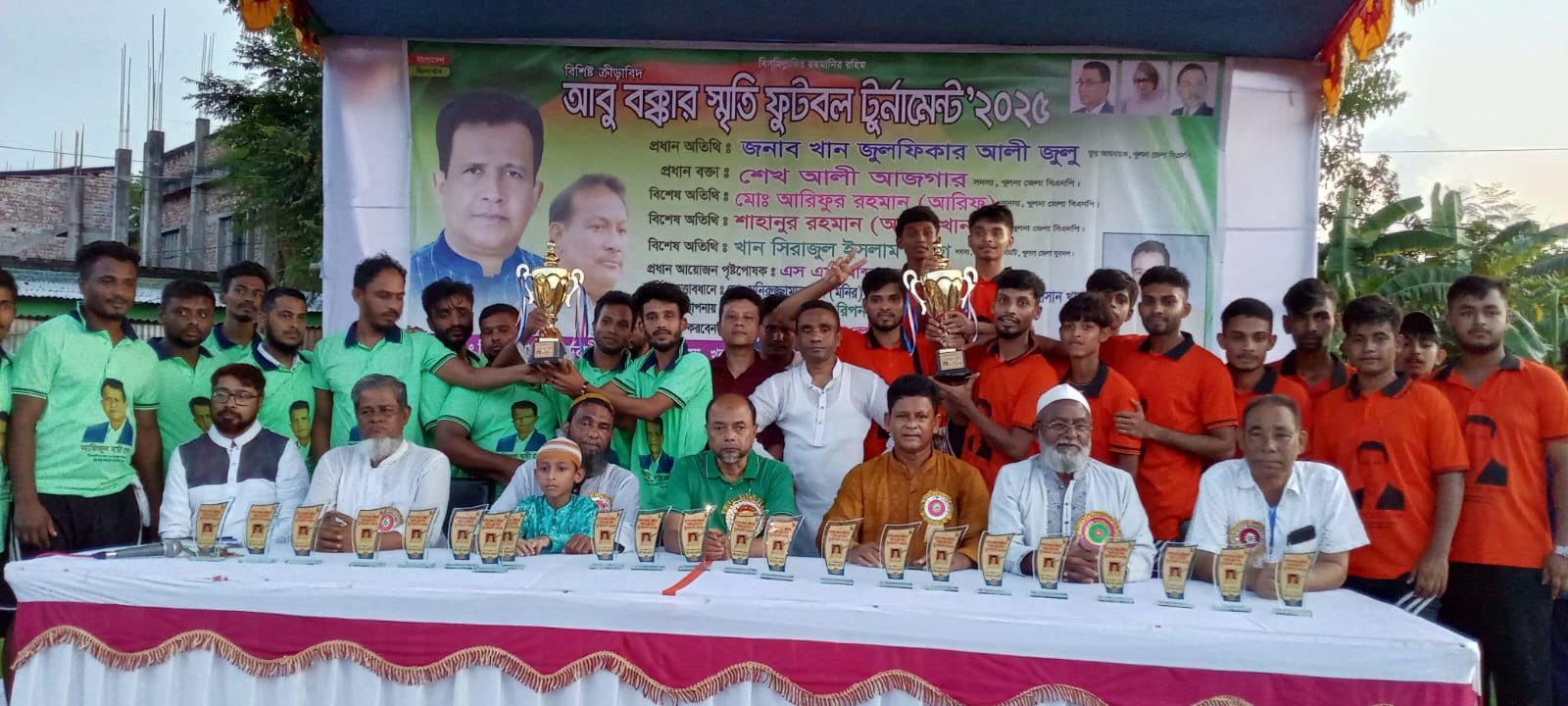 আজিজুল ইসলাম(স্টাফ রিপোর্টার)রূপসায় আইচগাতী ইউনিয়নের মিল্কী দেয়াড়া ওয়ার্ডবাসী আয়োজিত ক্রীড়াবিদ আবু বক্কার স্মৃতি ফুটবল টুর্নামেন্টের উদ্বোধনী ও ফাইনাল খেলা ১২ সেপ্টেম্বর বিকালে মিল্কী দেয়াড়া প্রাইমারি স্কুল মাঠে অনুষ্ঠিত হয়। খেলায় অংশগ্রহণ করে আবু বক্কার স্মৃতি আনম্যারেড ফুটবল দল ও আবু বক্কার স্মৃতি ম্যারেড ফুটবল দল। খেলায় আবু বক্কার ম্যারেড ফুটবল দলকে ২-০ গোলে হারিয়ে আবু বক্কার আনম্যারেড ফুটবল দল চ্যাম্পিয়ন হওয়ার গৌরব অর্জন করে। খেলায় বিজয়ী দলের হয়ে দুইটি গোলটি করতে সক্ষম হন আবির আকন ও স্বাধীন। ম্যাচ রেফারি হিসাবে খেলা পরিচালনা করেন মোঃ স্বাধীন,মোঃ ইমরান খান ও মোঃ নাঈম শিকদার।প্রধান অতিথি হিসাবে ফুটবল টুর্নামেন্টের উদ্বোধন করেন খুলনা জেলা বিএনপির যুগ্ম আহবায়ক খান জুলফিকার আলী জুলু। খেলা শেষে পুরষ্কার বিতরণী অনুষ্ঠানে প্রধান বক্তৃার বক্তৃতা করেন খুলনা জেলা বিএনপির সদস্য শেখ আলী আজগর। বিশেষ অতিথির বক্তৃতা করেন খুলনা জেলা বিএনপির সদস্য মোঃ আরিফুর রহমান আরিফ, শাহানুর রহমান আরজু খান,খুলনা জেলা যুবদলের সদস্য খান সিরাজুল ইসলাম পরাগ।প্রধান পৃষ্ঠপোষকতায় ছিলেন এসএম আবদুল্লাহ। সার্বিক তত্বাবধানে মোঃ মনিরুজ্জামান খান,মোঃ আবুল হাসনাত হাসান ও মেহেদী হাসান খান।ওয়ার্ড বিএনপির সাবেক সভাপতি আব্দুস সোবহান হাওলাদারের সভাপতিত্বে ও উত্তর রূপসা থানা ছাত্রদলের আহবায়ক মোঃ হৃদয় আহম্মেদ রিপনের পরিচালনায় বক্তৃতা করেন রূপসা উপজেলার বিএনপির যুগ্ম আহবায়ক এসএম সবুর,আইচগাতী ক্যাম্প ইনচার্জ ইব্রাহিম হাওলাদার,প্রধান শিক্ষক মোতাহার হোসেন,লিটন তালুকদার,আসাবুর হোসেন,কাজী মাখন,মোঃ জাকির গরিবুল্লাহ,শাহিন হাওলাদার,আঃ আজিজ, আদনান হোসন,শেখ মামুন,এনামুল কাজী,মোঃ বাবুল খান,শেখ কাউসার, আঃ সাত্তার খান,রাসেল খান,জাকির শেখ,কাজী পান্ত,মোঃ ইমরান,রনি প্রমূখ।