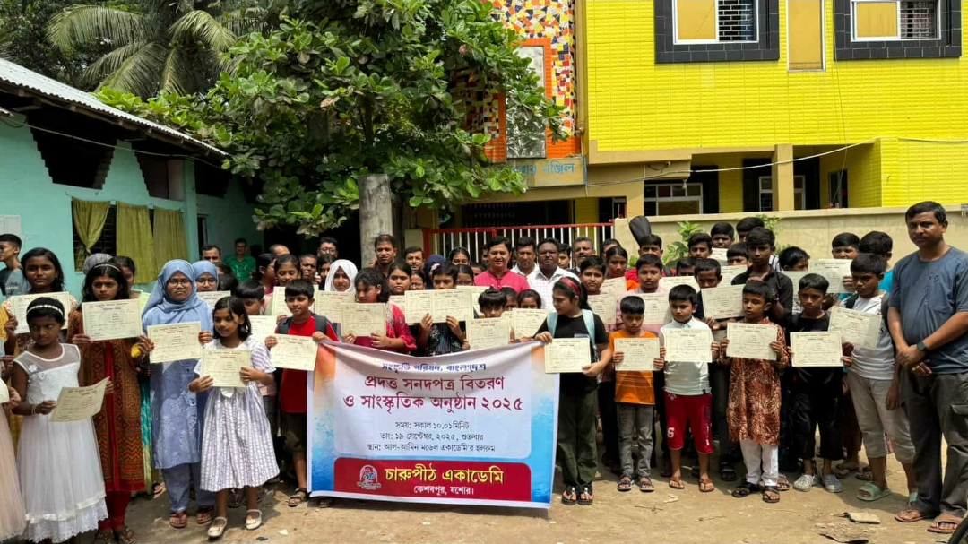 পরেশ দেবনাথ(নিজস্ব প্রতিনিধি)কেশবপুর চারুপীঠ একাডেমির উত্তীর্ণ শিক্ষার্থীদের সংস্কৃতি পরিষদ, বাংলাদেশ অধীনে সাংস্কৃতিক বোর্ড পরীক্ষার সনদপত্র অনুষ্ঠানিভাবে বিতরণ করা হয়েছে। শুক্রবার (১৯ সেপ্টেম্বর-২৫) সকালে শহরের আল আমিন মডেল একাডেমির হলরুমে সনদপত্র বিতরণ অনুষ্ঠানে সভাপতিত্ব করেন, কেশবপুর চারুপীঠ একাডেমির নির্বাহী পরিচালক উৎপল দে। প্রধান অতিথি হিসাবে বক্তব্য দেন, উপজেলা সিনিয়র মৎস্য অফিসার সুদেব বিশ্বাস।বিশেষ অতিথির বক্তব্য দেন, উপজেলা পল্লী উন্নয়ন অফিসার সুজন চন্দ্র, কলারোয়া উপজেলা সহকারি শিক্ষা অফিসার আনিচুর রহমান, তালা উপজেলা সহকারি শিক্ষা অফিসার বাবলু রহমান, মনিরামপুর উপজেলা সহকারি শিক্ষা অফিসার সাহিদুল ইসলাম, কলারোয়া উপজেলা সহকারি শিক্ষা অফিসার রফিকুল ইসলাম।শুভেচ্ছা বক্তব্য রাখেন, চারুপীঠ একাডেমির সহ সভাপতি ও ন্যাশনাল প্রেস সোসাইটি, গণমাধ্যম ও মানবাধিকার সংস্থা কেশবপুর উপজেলা শাখার সভাপতি সাংবাদিক শামীম আক্তার মুকুল, সহ সভাপতি শিক্ষক সাহা বৈদ্যনাথ, সহকারি পরিচালক মৌসুমী মজুমদার প্রমূখ।কেশবপুর চারুপীঠ একাডেমির চারুকারু, সংগীত, কবিতা আবৃত্তি, নৃত্য ও তবলা বিভাগ থেকে ১৩১ জন শিক্ষার্থী পরীক্ষায় অংশ নিয়ে সবাই উত্তীর্ণ হয়েছে। এর মধ্যে জিপিএ-৫ পেয়েছে ১০১ জন শিক্ষার্থী। জন্মলগ্ন থেকে কেশবপুর চারুপীঠ একাডেমির শিক্ষার্থীরা এই প্রতিষ্ঠানের ঐতিহ্য বহন করে চলেছে। উপজেলার প্রত্যন্ত অঞ্চল থেকে শিক্ষার্থীরা এই প্রতিষ্ঠানে আসে এবং অভিজ্ঞ শিক্ষকমণ্ডলী দ্বারা কেশবপুরের এই চারুপীঠ একাডেমি পরিচালিত হয়ে আসছে।
