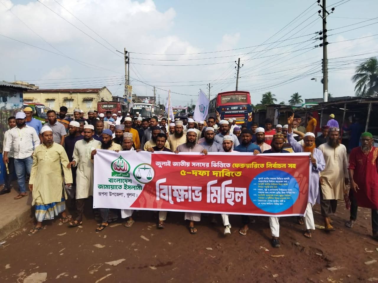 আজিজুল ইসলাম(স্টাফ রিপোর্টার)বাংলাদেশ জামায়াতে ইসলামীর কেন্দ্র ঘোষিত কর্মসূচির আওতায় জুলাই জাতীয় সনদের ভিত্তিতে ফ্রেব্রুয়ারিতে নির্বাচন সহ ৫ দফা দাবিতে রূপসা উপজেলা জামায়াতে ইসলামীর আয়োজনে বিক্ষোভ-মিছিল ও সমাবেশ ১৯ সেপ্টেম্বর শনিবার বিকেল ৩টায় অনুষ্ঠিত হয়।মিছিল-পূর্ব বিক্ষোভ এ সমাবেশটি উপজেলার দুইটি অংশ অনুষ্ঠিত হয়। রূপসা উপজেলা জামায়াতে ইসলামীর আমির মাওঃ লবিবুল ইসলামের সভাপতিত্বে (একাংশ) উপজেলার আইচগাতী সরকারি কলেজের সামনে অনুষ্ঠিত হয়।আইচগাতী ইউনিয়ন সেক্রেটারি মোঃ সিরাজুল ইসলামের পরিচালনায় পবিত্র কোরআন তেলাওয়াতের মাধ্যমে বিক্ষোভ সমাবেশে বক্তৃতা রাখেন উপজেলা তারবিয়াত সেক্রেটারি হাফেজ জাহাঙ্গীর ফকির, আইচগাতী ইউনিয়ন আমির মাওলানা হেকমত আলী, শ্রীফলতলা ইউনিয়ন আমির মোল্যা সেলিম আজাদ, ঘাটভোগ ইউনিয়ন সভাপতি নাসিম সরদার, আইচগাতী ইউনিয়ন সেক্রেটারি মোঃ সিরাজুল ইসলাম,শ্রীফলতলা ইউনিয়ন সেক্রেটারি মোঃ আব্দুর কাদের,উপজেলা শ্রমিক কল্যান ফেডারেশনের সহ-সভাপতি মোঃ নাসিরুদ্দিন, জামায়াত নেতা শেখ সাদি লিটন, মাওলানা মনিরুজ্জামান, ডাঃ রফিকুল ইসলাম,মোঃ আলী হোসেন, মোঃ জাহিদুল ইসলাম প্রমুখ।অপরদিকে বিক্ষোভ মিছিলের (আর এক অংশ) পূর্ব রুপসা বাস স্ট্যান্ড এলাকায় বিকাল ৩টায় রুপসা উপজেলা জামায়াতে ইসলামীর সেক্রেটারি হাবিবুল্লাহ ইমনের সভাপতিত্বে অনুষ্ঠিত হয়।নৈহাটি ইউনিয়ন সেক্রেটারি আজিজুল ইসলামের পরিচালনায় বক্তৃতা করেন নৈহাটি ইউনিয়ন আমির মুফতি মাওলানা মহিউদ্দিন, টিএসবি ইউনিয়ন আমীর অধ্যাপক আসাদুজ্জামান, শ্রমিক কল্যাণ ফেডারেশন খুলনা জেলা সেক্রেটারি মোঃ নাজিম উদ্দিন, উপজেলা কর্মপরিষদ সদস্য মোঃ আনোয়ার আলী, উপজেলা যুব ও ছাত্র বিষয়ক সভাপতি অধ্যাপক মুহাম্মদ গিয়াস উদ্দিন,শ্রমিক কল্যাণ ফেডারেশন উপজেলা সভাপতি মোঃ জসিম উদ্দিন, সহ-সভাপতি মুহাম্মদ আবুল খায়ের, সেক্রেটারি ফিরোজ শেখ, ইসলামী ছাত্রশিবির রূপসা (পূর্ব) শাখার সভাপতি মো. আল-আমিন, সেক্রেটারী মো. শ্রাবণ।এসময় অন্যানের মধ্যে উপস্থিত ছিলেন জামায়াত নেতা মো. সেলিম রেজা, মাওঃ হেদায়েতুল্লাহ, এম আল হেলাল মুন্সী, আজিজুল হক, হাফেজ মাওঃ গোলাম রসুল, আঃ মান্নান, ক্বারী মাওঃ মামুনুর রশিদ, শাহজাহান হাওলাদার, আবুল বাশার, রবিউল ইসলাম, জামায়াত নেতা ডা. সাইফুল ইসলাম, মাওঃ নজরুল ইসলাম, রকিব উদ্দিন রশিদ, মোহাম্মদ সাফিয়া রহমান, মাওলানা মোঃ ইব্রাহিম খলিল, মোহাম্মদ মনিরুল ইসলাম, হাফেজ মোহাম্মদ নেয়ামত কাজী, মাওলানা আব্দুল গফফার, মোহাম্মদ আলমগীর ফকির, আবু বক্কর সিদ্দিক, লিটন শেখ, মুজিবুর রহমান, মাওলানা আইয়ুব আলী গাজী, মাওলানা নূর মোহাম্মদ, রফিকুল ইসলাম, মোহাম্মদ আবু ইউসুফ, মোহাম্মদ আজি