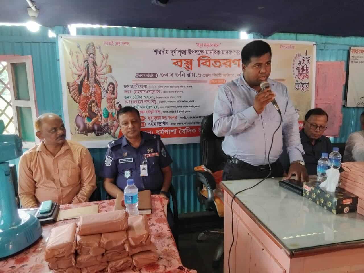 চয়ন চৌধুরী/সুনামগঞ্জের ধর্মপাশায় হিন্দ ধর্মাবল্বীদের সর্ব বৃহৎ শারদীয় দুর্গাপূজা উদযাপনকে সামনে রেখে দরিদ্র নারী-পুরুষের মধ্যে বস্ত্র বিতরণ করা হয়েছে।বুধবার (২৪ সেপ্টেম্বর) বিকেলে উপজেলার সদর ইউনিয়নের বৈদিক সনাতন সামাজিক সংগঠনের উদ্যোগে সংগঠনটির কার্যালয়ে আনুষ্ঠানিকভাবে এসব বস্ত্র বিতরণ করা হয়।অনুষ্ঠানে ১২০ জন অসহায় নারী-পুরুষের হাতে শাড়ি ও লুঙ্গি তুলে দেওয়া হয়।সংগঠনের সভাপতি দুলাল চন্দ্র সরকারের সভাপতিত্বে অনুষ্ঠানে প্রধান অতিথি হিসেবে উপস্থিত ছিলেন, উপজেলা নির্বাহী কর্মকর্তা (ইউএনও) জনি রায়।সাধারণ সম্পাদক অসীম চন্দ্র শীলের সঞ্চালনায় অনুষ্টানে বক্তব্য রাখেন, ধর্মপাশা থানার ওসি মোহাম্মদ এনামুল হক, উপজেলা সমাজসেবা কর্মকর্তা তৌফিক আহমেদ, উপজেলা বিএনপির সাবেক সাধারণ সম্পাদক কাজী মাজহারুল হক, সুনামগঞ্জ কেন্দ্রীয় শ্রীশ্রী দুর্গাবাড়ী মন্দির পরিচালনা কমিটির সভাপতি বিকাশ রঞ্জন চৌধুরী ভানু, উপজেলা পূজা উদযাপন পরিষদের সভাপতি যতীন্দ্র চন্দ্র সরকার, ধর্মপাশা সৎসঙ্গ শ্রী মন্দির পরিচালনা কমিটির সভাপতি তরুণ বর্ধন, শ্রীশ্রী রাধা গোবিন্দ মন্দির পরিচালনা কমিটির ভারপ্রাপ্ত সভাপতি মতি লাল দেবনাথ, সিনিয়র সাংবাদিক সালেহ আহমদ ও উপজেলা যুবদলের যুগ্ম আহ্বায়ক মেহেদী হাসান উজ্জ্বল প্রমুখ।বক্তারা বলেন, শারদীয় দুর্গাপূজা শুধু ধর্মীয় উৎসব নয়, এটি একটি সামাজিক সম্প্রীতির উৎসব। অসহায় মানুষের মুখে হাসি ফোটাতে এমন উদ্যোগ প্রশংসনীয়।