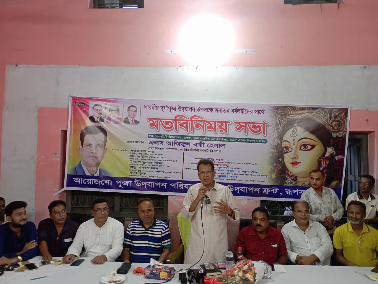 আজিজুল ইসলাম(স্টাফ রিপোর্টার)রূপসায় কেন্দ্রীয় বিএনপি'র তথ্য বিষয়ক সম্পাদক আজিজুল বারী হেলাল বলেছেন,আমাদের দেশে সকল ধর্মের মানুষ যুগ যুগ ধরে সাম্প্রদায়ীক সম্প্রতি বজায় রেখে বসবাস করে আসছে। যেখানে কোন ভেদাভেদ নেই। এজন্য আমাদের সকল অশুভ শক্তির বিরুদ্ধে বিজয়ী হতে হবে। তাহলেই আমরা সামনের দিকে এগিয়ে যেতে পারবো। তিনি আরো বলেন, শারদীয় দুর্গোৎসব সুষ্ঠু ও সুন্দরভাবে পালনের লক্ষ্যে আইনশৃঙ্খলা রক্ষাকারী বাহিনীর পাশাপাশি সবাইকে এগিয়ে আসতে হবে। যাতে কেউ অনাকাঙ্খিত ঘটনা ঘটাতে না পারে কার জন্য সবাইকে সজাগ দৃষ্টি রাখতে হবে।তিনি বলেন বিএনপি সরকার গঠন করতে পারলে বাংলাদেশের প্রতিটি উপজেলায় একটি করে মডেল মন্দির নির্মাণ করা হবে। সেসময় উক্ত মন্দির গুলোতে হিন্দু ধর্মালম্বীরা নির্বিঘ্নে পুজা অর্চনা করতে পারবে। বিএনপি একটি অসাম্প্রদায়িক রাজনৈতিক দল এ দলে হিন্দু মুসলিম বৌদ্ধ খ্রিস্টান সকলের অধিকার সমান। এ কারনে হিন্দু সম্প্রদায়ের ভোটে বিগত সময় ৩/৪ বার বিএনপি সরকার গঠন করে রাষ্ট্র পরিচালনা করেছিলো। আগামী নির্বাচনেও তাদের ভোটাধিকারের মাধ্যমে বিএনপি রাষ্ট্র পরিচালনা করবে। তিনি গতকাল ২৫ সেপ্টেম্বর বিকেলে রূপসা উপজেলার বিআরডিবি মিলনায়তনে রূপসা পূজা উদযাপন পরিষদ ও পূজা উদযাপন ফ্রন্টের আয়োজনে শারদীয় দুর্গাপূজা উদযাপন উপলক্ষে সনাতন ধর্মালম্বীদের সাথে মতবিনিময় সভায় প্রধান অতিথির বক্তব্যে একথা বলেন। মতবিনিময় সভায় বিশেষ অতিথির বক্তৃতা করেন খুলনা জেলা বিএনপির যুগ্ম আহবায়ক খান জুলফিকার আলী জুলু, মোল্যা খায়রুল ইসলাম, জিএম কামরুজ্জামান টুকু, জেলা বিএনপির সাবেক যুগ্ম আহবায়ক মোস্তফা উল বারী লাভলু, খুলনা জেলা স্বেচ্ছাসেবক দলের আহবায়ক আতাউর রহমান রুনু, রূপসা উপজেলা বিএনপির আহবায়ক মোল্যা সাইফুর রহমান,সদস্য সচিব জাবেদ হোসেন মল্লিক,জেলা শ্রমিকদলের সভাপতি উজ্জল কুমার সাহা,উপজেলা বিএনপির সিনিয়র যুগ্ম আহবায়ক বিকাশ মিত্র। মতবিনিময় সভায় রূপসা উপজেলা পূজা উদযাপন ফ্রন্টের সভাপতি রাজু দাসের সভাপতিত্বে ও রূপসা পূজা উদযাপন পরিষদের সাধারণ সম্পাদক সাংবাদিক কৃষ্ণ গোপাল সেনের সঞ্চলনায় স্বাগত বক্তৃতা করেন রূপসা পূজা উদযাপন পরিষদের সভাপতি শক্তিপদ বসু।