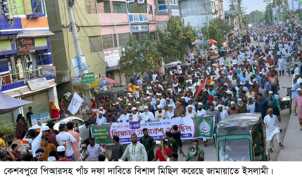 পরেশ দেবনাথ(নিজস্ব প্রতিনিধি)যশোরের কেশবপুরে জামায়াতে ইসলামীর উদ্যোগে শুক্রবার বিকেলে পিআরসহ পাঁচ দফা দাবিতে বিশাল মিছিল ও সমাবেশ করেছে জামায়াতে ইসলামী। মিছিলটি কেশবপুর পাবলিক ময়দান থেকে শুরু হয়ে শহরের প্রধান প্রধান সড়ক প্রদক্ষিণ করে পুনরায় ওই স্থানে গিয়ে শেষ হয়।এর আগে কেশবপুর পাবলিক ময়দানে উপজেলা জামায়াতে ইসলামীর আমির অধ্যাপক মোক্তার আলীর সভাপতিত্বে অনুষ্ঠিত সমাবেশে প্রধান অতিথির বক্তব্য দেন, যশোর জেলা জামায়াতে ইসলামীর নায়েবে আমির অধ্যাপক হাবিবুর রহমান। সমাবেশে বিশেষ অতিথি ছিলেন, যশোর জেলা জামায়াতে ইসলামীর সহকারী সেক্রেটারি বিল্লাল হুসাইন, কর্মপরিষদ সদস্য মাওলানা আব্দুস সামাদ, উপজেলা নায়েবে আমির মাওলানা রেজাউল করিম, সেক্রেটারি মাস্টার রফিকুল ইসলাম, সহকারী সেক্রেটারি অধ্যাপক তবিবুর রহমান ও উপজেলা সমাজকল্যাণ বিষয়ক সম্পাদক কৃষিবিদ তাজামুল ইসলাম দীপুসহ অন্যান্য দায়িত্বশীল নেতৃবৃন্দ।সমাবেশে পিআর-সহ ৫ দফা দাবি উপস্থাপন করা হয়। দাবিগুলো হলো-জুলাই জাতীয় সনদের ভিত্তিতে আগামী ফেব্রুয়ারিতে নির্বাচন আয়োজন, আগামী জাতীয় নির্বাচনে উভয় কক্ষে পিআর পদ্ধতি চালু, অবাধ, সুষ্ঠু ও গ্রহণযোগ্য নির্বাচনের লক্ষ্যে সকলের জন্য সমান সুযোগ নিশ্চিত করা, বিগত সরকারের জুলুম-নির্যাতন, গণহত্যা ও দুর্নীতির বিচার নিশ্চিত করা এবং স্বৈরাচারের দোসর জাতীয় পার্টি ও ১৪ দলের কার্যক্রম বন্ধ করা।