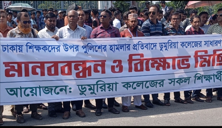 নিজস্ব প্রতিবেদক/খুলনার ডুমুরিয়া ডিগ্রি কলেজের প্রধান গেটের সামনে খুলনা সাতক্ষীরা মহাসড়কে আজ সকাল ১০টায় ঢাকায় শিক্ষকদের উপর সাম্প্রতিক পুলিশের হামলার প্রতিবাদে এক মানববন্ধন অনুষ্ঠিত হয়েছে। এতে কলেজের শিক্ষক,শিক্ষার্থীসহ অংশগ্রহণ করেন।এসম উপস্থিত ছিলেন, ভারপ্রাপ্ত অধ্যক্ষ ডঃ ফেরদৌস খান, উপাধ্যক্ষ বিষ্ণুপদ মণ্ডল ,সহঃ অধ্যাপক মোঃ নূরুল ইসলাস খান,অধ্যাপক মজাম্মেল হোসেন, অধ্যাপক শিশির কুমার সিংহ,অধ্যাপক শেখকামরুজ্জান,সহ:অধ্যাক্ষ মহিদুজ্জামাব গাজী, সহঃ অধ্যাপক মোঃ আচ্ছাদুর রহমান,সহঃ অধ্যাপক মোঃ বকুল হোসেন,সহঃ মাগছুরা খাতুন, সহঃ অধ্যাপক তানজিনা আক্তার, সহঃ অধ্যাপক চন্দনা রানী, সহঃ অধ্যাপক সিনিদ্ধা বেগম, সহঃঅধ্যাপক সফিকুল ইসলাম, সহঃ অধ্যাপক বিধু ভুষন সরকার সহ প্রমুখ।মানববন্ধনে বক্তারা বলেন, দেশের শিক্ষক সমাজ জাতি গঠনের কারিগর। তাদের উপর অন্যায়ভাবে হামলা চালানো শুধু লজ্জাজনক নয়, এটি শিক্ষাব্যবস্থার প্রতি চরম অবমাননা। শিক্ষকরা সবসময় শান্তিপূর্ণ উপায়ে তাদের দাবি-দাওয়া তুলে ধরেন, কিন্তু সাম্প্রতিক ঘটনাটি পুলিশি বর্বরতার এক দৃষ্টান্ত স্থাপন করেছে বলে অভিযোগ করেন বক্তারা।