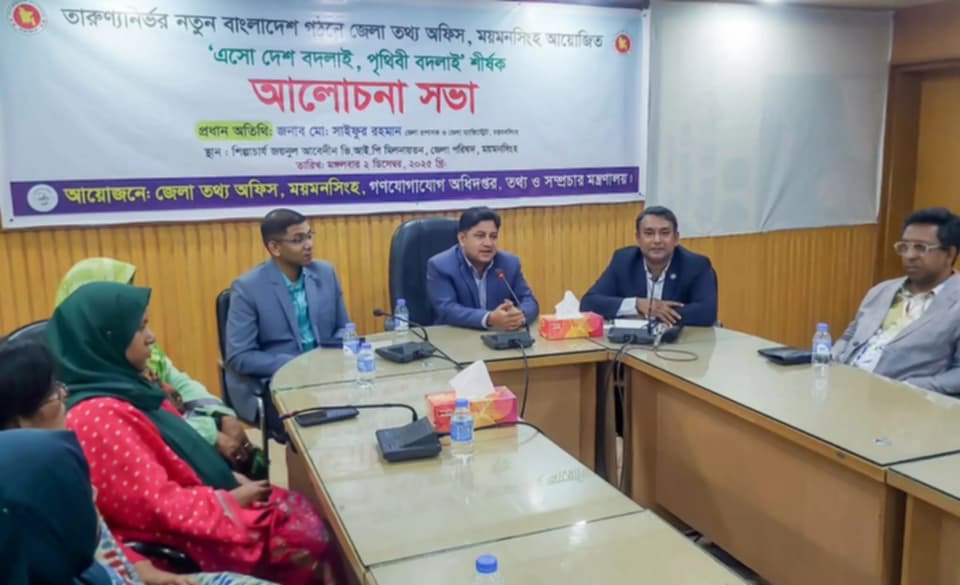 গোলাম কিবরিয়া পলাশ/তারুণ্যনির্ভর নতুন বাংলাদেশ গঠনে জেলা তথ্য অফিস, ময়মনসিংহের আয়োজনে 'এসো দেশ বদলাই, পৃথিবী বদলাই' শীর্ষক আলোচনা সভা অনুষ্ঠিত হয়েছে। ময়মনসিংহ জেলা পরিষদের শিল্পাচার্য জয়নুল আবেদীন মিলনায়তনে মঙ্গলবার (০২ ডিসেম্বর) বিকেলে এ সভা অনুষ্ঠিত হয়।জেলা তথ্য অফিস, ময়মনসিংহের পরিচালক মীর আকরাম উদ্দীন আহম্মদের সভাপতিত্বে অনুষ্ঠিত আলোচনা সভায় প্রধান অতিথি হিসেবে উপস্থিত ছিলেন ময়মনসিংহের অতিরিক্ত জেলা প্রশাসক (সার্বিক) রেজা মো. গোলাম মাসুম প্রধান।প্রধান অতিথি বলেন, ইতিবাচক পরিবর্তনের মধ্য দিয়ে রাষ্ট্রকে এগিয়ে নিতে হবে। সভ্যতার অগ্রগতির সাথে সাথে প্রযুক্তির ইতিবাচক দিকগুলো গ্রহণ এবং নেতিবাচক দিকগুলো বর্জন করতে হবে। যুগের চাহিদার সাথে খাপ খাইয়ে তরুণ সমাজকে নিজেদের এগিয়ে নিতে হবে। গতিশীল জীবনে থেমে না গিয়ে সুচিন্তিতভাবে জীবনের মূল্যবান উপাদানগুলো বেছে নিতে হবে। তারুণ্যের শক্তি নিয়ে সমাজ, রাষ্ট্র গঠনে অমিত সম্ভাবনাময় বাংলাদেশ গঠনে তরুণদের এগিয়ে আসতে হবে। স্বকীয় দক্ষতা বা স্কিল বৃদ্ধি করে তরুণদের বৈশ্বিক নাগরিক হিসেবে নিজেদের তৈরি করে তুলতে হবে।সভাপতির বক্তব্যে জেলা তথ্য অফিস, ময়মনসিংহের পরিচালক তরুণদের দক্ষতা বৃদ্ধিতে গুরুত্বারোপ করেন। তরুণরা যদি দেশের নিম্ন, উচ্চ যে কোনো পর্যায়ের মানুষকে সম্মান করতে শেখে, তবে তারা মানুষ হিসেবে আরো বড় হয়ে উঠবে বলে মন্তব্য করেন।আলোচনা সভায় অংশগ্রহণকারী তরুন প্রতিনিধিদের আলোচনায় উঠে আসে যে, সমাজ ও রাষ্ট্রের পরিবর্তনে সবচেয়ে অগ্রগামী ভূমিকা পালন করতে পারে দেশের তরুণসমাজ। তরুণদের অংশগ্রহণ ছাড়া ২৪-এর আন্দোলন সফল হতে পারতো না।আলোচনা সভায় সূচনা বক্তব্য রাখেন জেলা তথ্য অফিস, ময়মনসিংহের উপ-পরিচালক শেখ মো. শহীদুল ইসলাম। অনুষ্ঠানে অন্যান্যদের মধ্যে বিদ্যাময়ী স্কুলের প্রধান শিক্ষিকা নাছিমা আক্তার, এনটিভি ময়মনসিংহের ব্যুরোপ্রধান সাংবাদিক আইয়ুব আলী, ইন্টারন্যাশনাল একাডেমি অব ফিল্ম অ্যান্ড মিডিয়ার নির্বাহী পরিচালক বিবেশ রায়, বৈষম্যবিরোধী ছাত্র-আন্দোলনের সমন্বয়ক গোকুল সূত্রধর মানিক, শিক্ষক-শিক্ষার্থী, তরুণ প্রজন্মের প্রতিনিধিসহ ইলেকট্রনিক ও প্রিন্ট মিডিয়ার সাংবাদিকবৃন্দ উপস্থিত ছিলেন।