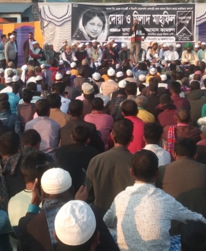 চয়ন চৌধুরী (ভ্রাম্যমাণ প্রতিবেদক) সুনামগঞ্জের ধর্মপাশায় হাজারো লোকের অংশগ্রহণে সদ্য প্রয়াত সাবেক প্রধানমন্ত্রী ও বিএনপির সাবেক চেয়ারপারসন বেগম খালেদা জিয়ার রুহের মাগফিরাত কামনায় মিলাদ ও দোয়া মাহফিল অনুষ্ঠিত হয়েছে। মঙ্গলবার বিকেলে উপজেলার পাইকুরাটি ইউনিয়ন বিএনপিসহ অঙ্গ ও সহযোগী সংগঠনের উদ্যোগে পাইকুরাটি বাজারের গরুহাট্টার মাঠে এ দোয়া ও মিল্লাদ মাহফিলের আয়োজন করা হয়।ইউনিয়ন বিএনপির আহবায়ক খোকন মুর্শেদের সভাপতিত্বে অনুষ্ঠানে সংক্ষিপ্ত আলোচনা সভায় প্রধান অতিথি হিসেবে বক্তব্য রাখেন, আগামী ত্রয়োদশ জাতীয় সংসদ নির্বাচনে সুনামগঞ্জ-১ আসনে বিএনপি মনোনীত প্রার্থী কামরুজ্জামান কামরুল। অনুষ্ঠানে পবিত্র কোরআন খতম শেষে বেগম খালেদা জিয়ার আত্মার শান্তি ও রুহের মাগফিরাত কামনায় বিশেষ মোনাজাত করা হয়। একই সঙ্গে দেশ ও জাতির সার্বিক কল্যাণ কামনা করা হয়।অনুষ্ঠানে প্রধান অতিথির বক্তৃতায় কামরুজ্জামান কামরুল বলেন, প্রয়াত দেশনেত্রী বেগম খালেদা জিয়া ছিলেন, বাংলাদেশের হিন্দু, মুসলমান, বৌদ্ধ, খৃষ্টানসহ সকল ধর্মের মানুষের প্রিয় নেত্রী। তাঁর আমলেই এ দেশের সকল ধর্মের মানুষই শান্তিতে নিজ নিজ ধর্ম পালন করেছেন। তিনি আওয়ামী ফ্যাসিস্ট সরকারের সকল অত্যাচার-নির্যাতন সহ্য করেও দেশ ও দেশের জনগণকে ছেড়ে কোথাও যাননি। যার ফলস্বরূপ মা বেগম খালেদা জিয়ার মৃত্যুর পর বর্তমান সরকারসহ দেশের জনগণ তাঁকে যে সম্মান দিয়েছেন, তা বাংলাদেশের রাজনৈতিক ইতিহাসে চিরস্মরণীয় হয়ে থাকবে। পাশাপাশি আল্লাহ তায়ালা যেন প্রয়াত দেশনেত্রী বেগম খালেদা জিয়ার সকল ভুল-ত্রুটি ক্ষমা করে তাঁকে জান্নাতুল ফেরদৌস নসিব করেন, সে জন্য তিনি সকলের কাছে দোয়া কামনা করেন।অনুষ্ঠিত এ দোয়া মাহফিলে এলাকার বিভিন্ন মসজিদ ও মাদ্রাসার ইমাম, মুয়াজ্জিন ও শিক্ষার্থীদের পাশাপাশি উপজেলা, ইউনিয়ন ও ওয়ার্ড পর্যায়ের বিএনপি এবং অঙ্গ ও সহযোগী সংগঠনের নেতাকর্মীসহ হাজারো লোক অংশ গ্রহণ করেন।