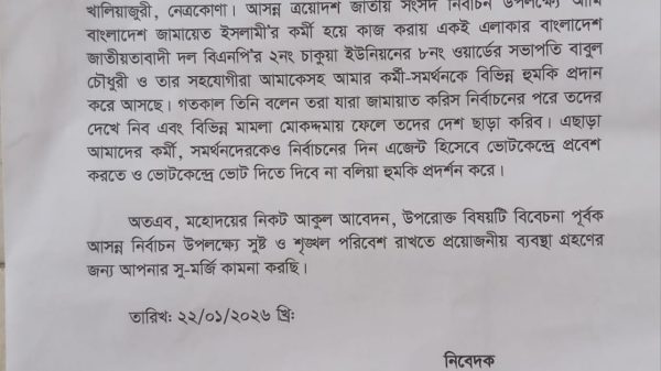 সুমন মাহমুদ/ শেখনেত্রকোনার খালিয়াজুরী উপজেলায় আসন্ন ত্রয়োদশ জাতীয় সংসদ নির্বাচনকে সামনে রেখে রাজনৈতিক উত্তাপ ছড়িয়ে পড়েছে। বাংলাদেশ জামায়াতে ইসলামীর অমুসলিম শাখার খালিয়াজুরী উপজেলা শাখার সভাপতি অরুণ বিশ্বাস নামে এক নেতার ...বিস্তারিত পড়ুন