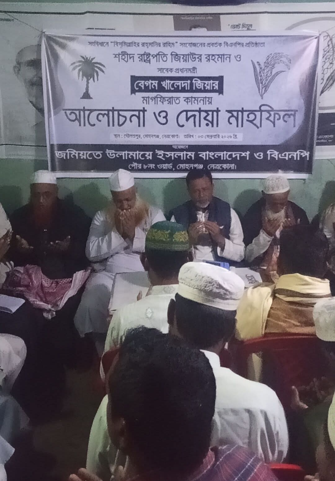 চয়ন চৌধুরী (ভ্রাম্যমাণ প্রতিবেদক)নেত্রকোনার মোহনগঞ্জে পবিত্র শবেবরাত উপলক্ষে শহীদ রাষ্ট্রপতি জিয়াউর রহমান ও প্রয়াত সাবেক প্রধানমন্ত্রী বেগম খালেদা জিয়ার আত্মার মাগফিরাত কামনায় আলোচনা ও দোয়া মাহফিল অনুষ্ঠিত হয়েছে। অনুষ্ঠানে দোয়া পড়ান, জমিয়তে উলামায়ে ইসলাম বাংলাদেশের মোহনগঞ্জ উপজেলা শাখার মুরব্বি মাওলানা নুরুল ইসলাম। মঙ্গলবার বাদ মাগরিব জমিয়তে উলামায়ে ইসলাম বাংলাদেশ মোহনগঞ্জ উপজেলা শাখা ও পৌরসভার ৮ নম্বর ওয়ার্ড বিএনপির যৌথ উদ্যোগে উত্তর দৌলতপুর বিএনপির নির্বাচনী কার্যালয়ে এ আলোচনা ও দোয়া মাহফিলের আয়োজন করা হয়। পৌরসভার ৮ নাম্বার ওয়ার্ড বিএনপির নির্বাচন পরিচালনা কমিটির প্রধান মঞ্জুরুল হকের সভাপতিত্বে ও জমিয়তে উলামায়ে ইসলাম বাংলাদেশের মোহনগঞ্জ উপজেলা শাখার সহ-সভাপতি হাফেজ শফিকুল ইসলাম রিপনের সঞ্চালনায় এ উপলক্ষে বক্তব্য রাখেন, জমিয়তে উলামায়ে ইসলাম বাংলাদেশের নেত্রকোনা জেলা শাখার সাংগঠনিক সম্পাদক মাওলানা রুহুল আমিন নগরী, সংগঠনটির মোহনগঞ্জ উপজেলা শাখার সভাপতি মাওলানা মাহমুদুল হাসান, পৌর বিএনপির সাধারণ সম্পাদক গোলাম রব্বানী পুতুল, উপজেলা জমিয়তের নেতা হাফেজ কারী মাসুম বিল্লাহ ্, মাওলানা তামিম আহমেদ, পৌর বিএনপির দপ্তর সম্পাদক হাফিজুর রহমান চয়ন, ছাত্র বিষয়ক সম্পাদক মো.খালেদ হোসেন তুহিন, ওয়ার্ড বিএনপির সাধারণ সম্পাদক মনিরুল ইসলাম মুনসেফ, সাবেক সাধারন সম্পাদক মুনসুর আলম, মঞ্জিল মিয়া, উপজেলা ছাত্রদলের আহবায়ক জামিউল ইসলাম রাকিব, পৌর ছাত্রদলের সদস্য সচিব কিরন খাঁ, উপজেলা ছাত্র জমিয়ত নেতা নাজমুল হক শান্ত, মাকসুদ হাসান মাসুম, মাওলানা নুরুজ্জামান, নিয়ামূল হক প্রমূখ।