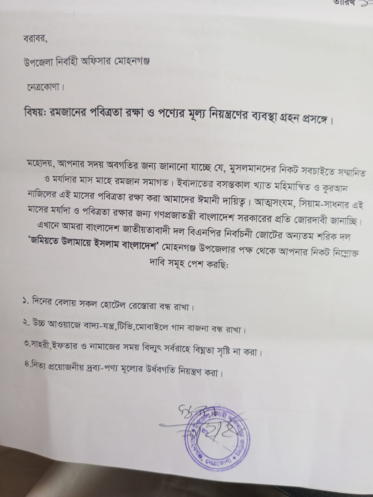 চয়ন চৌধুরী, (ভ্রাম্যমাণ প্রতিবেদক)নেত্রকোনার মোহনগঞ্জে রমজানের পবিত্রতা রক্ষায় উপজেলা প্রশাসনের নিকট জমিয়তে উলামায়ে ইসলামের পক্ষ থেকে স্মারক লিপি প্রদান করা হয়েছে।বুধবার দুপুরে জমিয়তে উলামায়ে ইসলাম বাংলাদেশের মোহনগঞ্জ উপজেলা শাখার সভাপতি মাওলানা মাহমুদুল হাসান ও সংগঠনটির নেত্রকোনা জেলা শাখার সাংগঠনিক সম্পাদক মাওলানা রুহুল আমীন নগরীর যৌথ স্বাক্ষরিত একটি স্মারকলিপি উপজেলা নির্বাহী কর্মকর্তার (ইউএনও) কাছে জমা দেওয়া হয়েছে।স্মারকলিপিতে রমজানের পবিত্রতা রক্ষায় নয়টি বিষয়ের উপর প্রশাসনের নজরদারি রাখার কথা উল্লেখ করা হয়েছে।এরমধ্যে রয়েছে, দিনের বেলায় সকল হোটেল রেস্তোরা বন্ধ রাখা।উচ্চ শব্দে বাদ্য-যন্ত্র, টিভি, মোবাইলে গান বাজনা বন্ধ রাখা।সাহরী, ইফতার ও নামাজের সময় বিদ্যুৎ সরবরাহে বিঘ্নতা সৃষ্টি না করা।নিত্য প্রয়োজনীয় দ্রব্য মূল্যের উর্ধবগতি নিয়ন্ত্রণ করা।বাজারে কৃত্রিম সংকট সৃষ্টিকারী অসাধু ব্যবসায়ীদর আইনের আওতায় আনতেনিয়মিত বাজার মনিটরিংয়ের ব্যবস্থা করা।হিজরা, বখাটেদের উৎপাত, চাঁদাবাজী বন্ধ ও মোবাইলে গেম-জোয়াখেলা বন্ধে কার্যকর ব্যবস্থা নেয়া।অতিরিক্ত ভাড়া আদায় ও যানঝট হতে মুক্তিপেতে পুলিশের টহল জোরদার করা।ওরশের নামে গান-বাজনা, মদ-গাঁজা জোয়ার আসর বসিয়ে ইসলাম ও সমাজ বিরোধী কর্মকান্ড বন্ধ করতে স্থানীয় জনপ্রতিনিধিদের সতর্ক করা।ভেজাল খাদ্যসহ যত্রতত্র খোলাবাজারে ইফতার সামগ্রী বিক্রি বন্ধে ব্যবস্থা নেয়ার উপর গুরুত্বারোপ করা হয়।