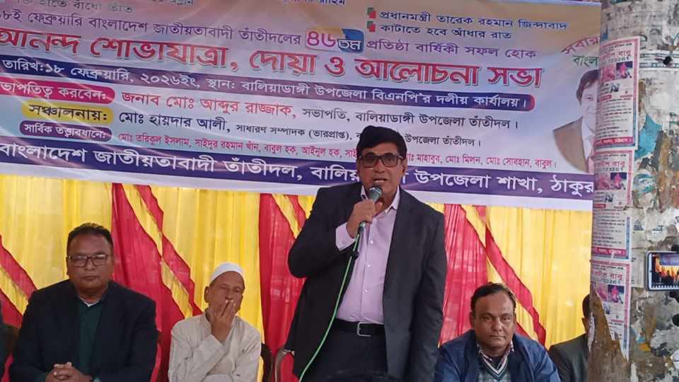 গীতি গমন চন্দ্র রায় গীতি(স্টাফ রিপোর্টার)দেশনেত্রী বেগম খালেদা জিয়া চির অম্লান শক্ত হাতে বাঁধো তাঁত প্রধানমন্ত্রী তারেক রহমান জিন্দাবাদ কাটতে হবে আঁধার রাত এই স্লোগানকে সামনে রেখে বালিয়াডাঙ্গী উপজেলা তাঁতীদলের ৪৬ তম প্রতিষ্ঠা বার্ষিকী উপলক্ষে আনন্দ শোভাযাত্রা দোয়া ও আলোচনা সভা অনুষ্ঠিত হয়েছে বুধবার ১৮ ফেব্রুয়ারী) বিকাল ৫ টার সময় বালিয়াডাঙ্গী উপজেলা তাঁতীদলের ৪৬ তম প্রতিষ্ঠা বার্ষিকী উপলক্ষে শহরের প্রদান প্রদান সড়ক পদক্ষিণ করে আনন্দ শোভাযাত্রা ও আলোচনা সভা উপজেলা বিএনপির দলীয় কার্যালয়ে সামনে অনুষ্ঠিত হয়। বালিয়াডাঙ্গী উপজেলা তাঁতীদলের সভাপতি আব্দুর রাজ্জাক এর সভাপতিত্বে উপজেলা তাঁতীদলের সাধারণ সম্পাদক হায়দার আলীর এর সঞ্চালনায় ওঅতিথি হিসেবে উপস্থিত ছিলেন উপজেলা বিএনপির আহ্বায়ক এডভোকেট ইউসুফ আলী, ঠাকুরগাঁও জেলা বিএনপির সাবেক সাংগঠনিক সম্পাদক ও বালিয়াডাঙ্গী বিএনপির আহবায়ক কমিটির যুগ্ম আহবায়ক,সাবেক চোয়ারম্যান মোঃ আবু হায়াত নুরুন্নবী উপজেলা বিএনপির আহ্বায়ক কমিটির সদস্য ও উপজেলা বিএনপির সাবেক ভারপ্রাপ্ত সভাপতি এডভোকেট সৈয়দ আলম, উপজেলা বিএনপি সাবেক সহ-সভাপতি আইয়ুব আলী খান, উপজেলা বিএনপির সাবেক দপ্তর সম্পাদক মুকবুল হোসেন, এসময় আরো অতিথি হিসাবে উপস্থিত ছিলেন উপজেলা শ্রমিক দলের সভাপতি আব্দুল রাজ্জাক, ও উপজেলা যুবদলের সভাপতি আব্দুল কাদের ও সাধারণ সম্পাদক এন্তাজুল হক, উপজেলা ছাত্রদলের সদস্য সচিব আবু সাঈদ সহ তাঁতী দলের দপ্তর সম্পাদক সহ উপজেলার ৮ টি ইউনিয়নে সভাপতি ও সাধারণ সম্পাদক সহ উপস্থিত ছিলেন সকল নেতৃবৃন্দ।এ সময় বক্তারা বলেন, জাতীয়তাবাদী তাঁতী দল, বিএনপির অন্যতম সহযোগী সংগঠন, ১৯৮০ সালের ১৮ ফেব্রুয়ারি বিএনপির প্রতিষ্ঠাতা, শহীদ রাষ্ট্রপতি জিয়াউর রহমান কর্তৃক প্রতিষ্ঠিত হয়, বিগত দিনে আওয়ামীলীগ আমাদের দলিয় কার্যক্রম বাঁধা সৃষ্টি করে আসছে, আমরা কোনো ধরনের মিছিল মিটিং করতে পারিনি, এখন আমাদের কথা বলা ও প্রতিবাদ করার সময় এসেছে, শহীদ জিয়াউর রহমানের আদর্শের সংগঠন তাঁতী দল, এই দলের মাধ্যমে আমরা সামাজিক কার্যক্রম ও দলকে সুসংগঠিত করে যাবো। উপজেলা নেতৃবৃন্দের সবার সহযোগিতায় সকলের ঐক্যবদ্ধ হয়ে তৃণমূল পর্যায়ে কাজ করে আমরা একটা আদর্শ বাদি সরকার গঠন করতে সক্ষম হয়েছি।এবং উপজেলা নেতৃবৃন্দের সকলের সহযোগিতায় ঠাকুরগাঁও - ২ আসনের ধানের শীর্ষের মনোনীত প্রার্থী ডাঃ আব্দুস সালাম এর বিজয় নিশ্চিত করতে সক্ষম হয়েছি,দলকে আরোও শক্তিশালী করতে হবে।পরিশেষে উপজেলার তাঁতী দলের ৪৬তম প্রতিষ্ঠা বার্ষিকী উপলক্ষে কেক কাটার মধ্যে দিয়ে অনুষ্ঠানের সমাপ্ত করেন।