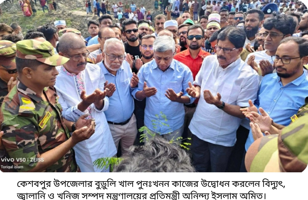 পরেশ দেবনাথ, (নিজস্ব প্রতিনিধি)গণপ্রজাতন্ত্রী বাংলাদেশ সরকারের মাননীয় প্রধানমন্ত্রী জনাব তারেক রহমান এঁর সদয় নির্দেশনার আলোকে সারা দেশব্যাপী খাল খনন কর্মসূচির অংশ হিসেবে যশোর জেলার কেশবপুর উপজেলার বুড়ুলি খাল পুনঃখনন কাজের শুভ উদ্বোধন করলেন বিদ্যুৎ, জ্বালানি ও খনিজ সম্পদ মন্ত্রণালয়ের প্রতিমন্ত্রী অনিন্দ্য ইসলাম অমিত। প্রধান অতিথি হিসেবে প্রতিমন্ত্রী কোদাল দিয়ে নিজ হাতে মাটি কেটে খাল পুনঃখনন কাজের শুভ উদ্বোধন করেন।বিদ্যুৎ, জ্বালানি ও খনিজ সম্পদ মন্ত্রণালয়ের প্রতিমন্ত্রী অনিন্দ্য ইসলাম অমিত বলেন, ‘খাল খনন কর্মসূচি শুরু হয়েছিল শহীদ রাষ্ট্রপতি জিয়াউর রহমানের হাত ধরে। যে কর্মসূচি পরবর্তীতে কৃষিতে বিপ্লব এনেছে। শহীদ রাষ্ট্রপতি জিয়াউর রহমানের শাহাদত বরণ কিংবা দেশনেত্রী বেগম খালেদা জিয়ার সরকার প্রধানের দায়িত্ব পালনের বাইরের সময়টা কিন্তু এই খাল খনন কর্মসূচি থেকে বাংলাদেশের মানুষ বঞ্চিত হয়েছিলেন। খাল খনন করলে মানুষের কাছে জিয়াউর রহমানের ছবিটি ভেসে উঠবে। সংকীর্ণতার কারণে পরবর্তী সরকারগুলো বুঝলেও ভিন্ন রাজনৈতিক দর্শনে বিশ্বাসী হওয়ায় তারা এই খাল খনন কর্মসূচি আর চালু রাখেননি। এতে ক্ষতি হয়েছে বাংলাদেশের জনগণের। বিএনপি রাষ্ট্র ক্ষমতায় আসায় প্রধানমন্ত্রী তারেক রহমানের প্রতিশ্রুতি অনুযায়ী জনগণের কথা চিন্তা করে দেশে খাল খনন কর্মসূচি শুরু হয়েছে’। শনিবার (২৮ মার্চ-২৬) সকালে যশোরের কেশবপুর উপজেলার বুরুলি খালের তিন কিলোমিটার পুনঃখনন কাজের উদ্বোধন অনুষ্ঠানে প্রধান অতিথির বক্তব্যে তিনি এসব কথা বলেন।